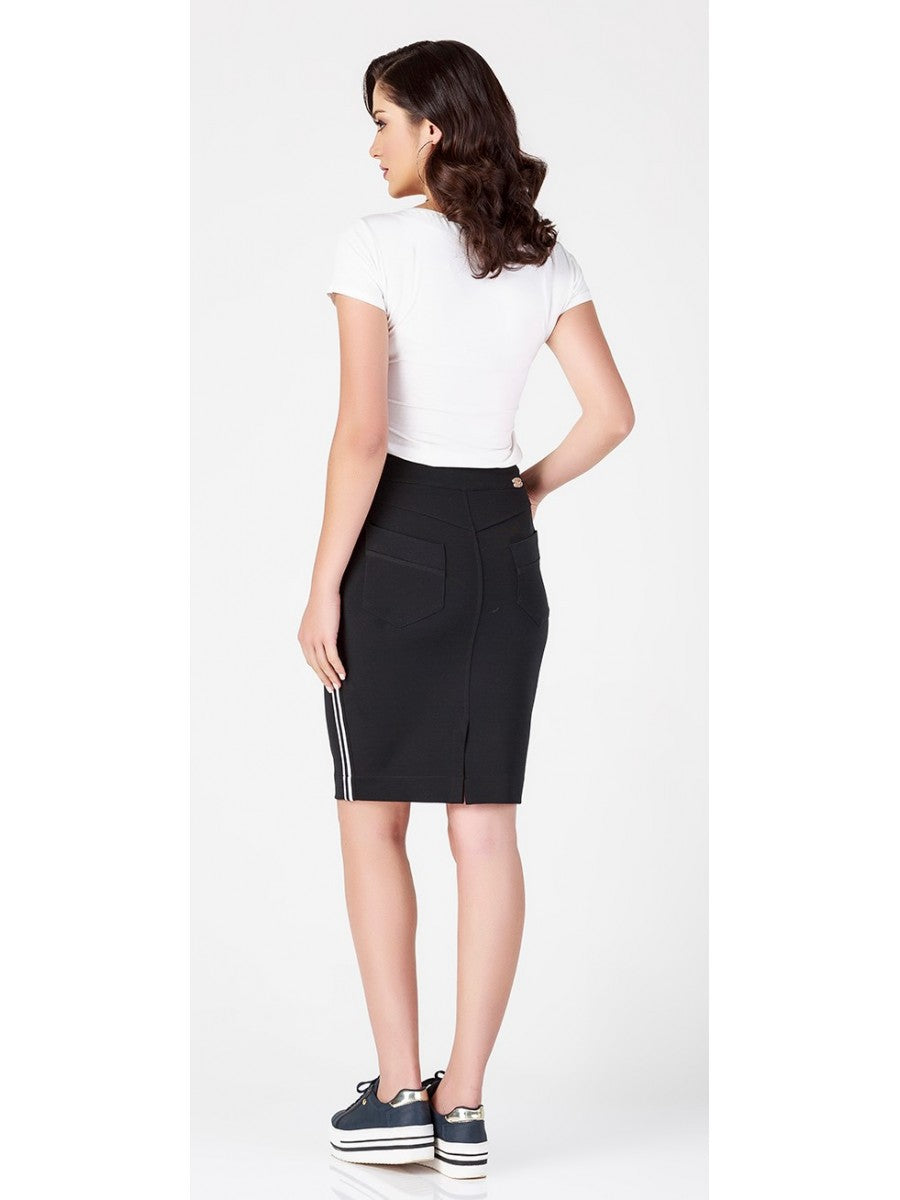 Saia preta com faixas laterais, bolsos e abertura em zíper frontal. Confeccionada em suplex encorpado com elastano, proporcionando conforto e um caimento impecável. Versátil e estilosa, ideal para diversas ocasiões.