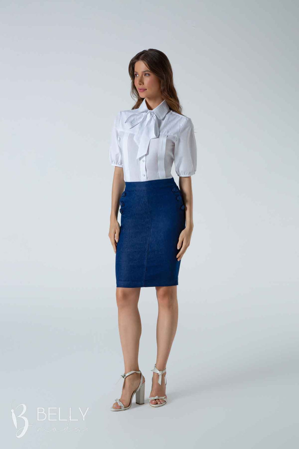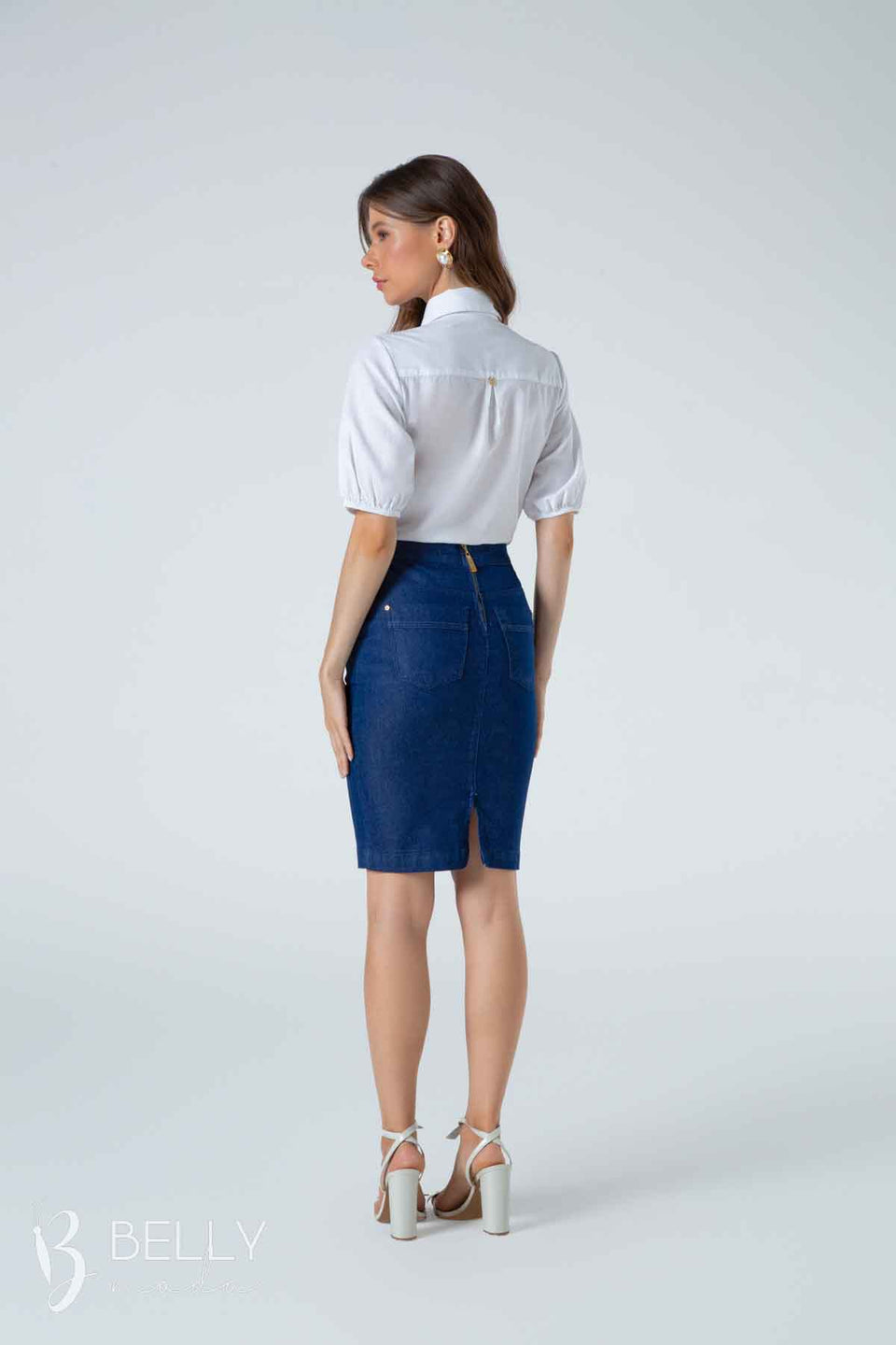 Combine esta saia reta jeans com uma blusa básica para um look casual ou com um blazer para um visual mais sofisticado.