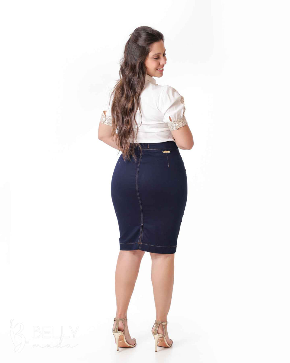 Uma saia reta em sarja azul marinho da marca Vecchi, confeccionada com sarja de alta qualidade e elastano para maior conforto. Possui modelagem tradicional, detalhes em aviamentos dourados e pesponto em cor de linha ocre. Com comprimento abaixo do joelho, possui fechamento frontal em botões na lateral, proporcionando uma identidade única à peça. Versátil e descolada, é ideal para diversas composições.