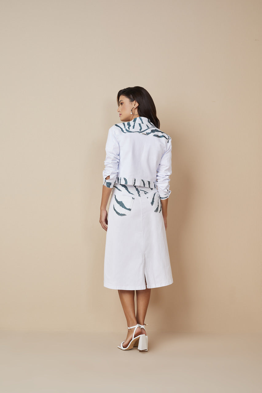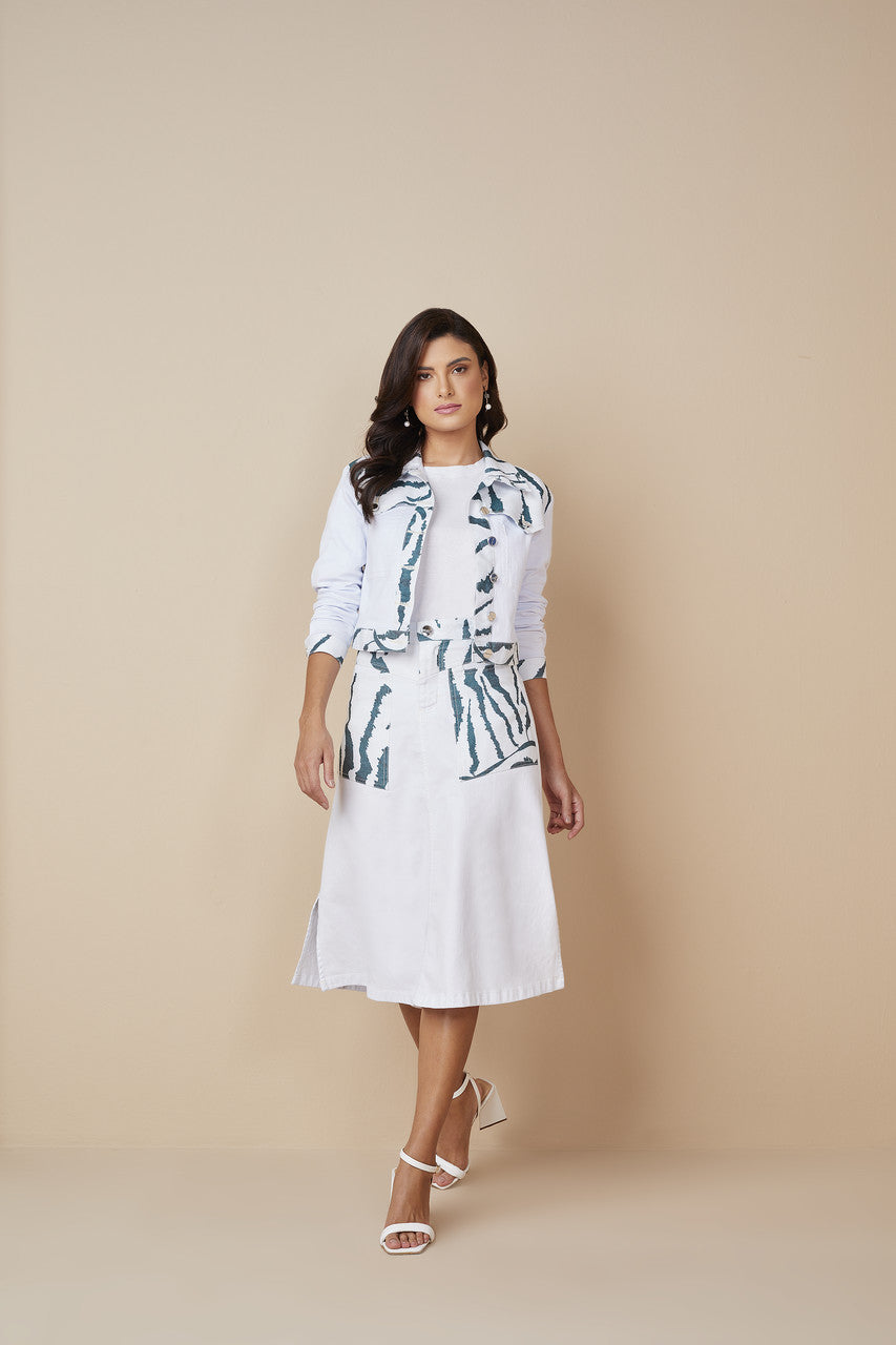 Destaque-se com a Saia Evasê Sarja Com Estampa Exclusiva Titanium Jeans. Feita em sarja na cor branca, possui uma estampa exclusiva Savage Botânica em verde, garantindo um visual único e cheio de estilo. Sua modelagem evasê valoriza a cintura e proporciona conforto, enquanto as aberturas laterais adicionam um toque delicado.