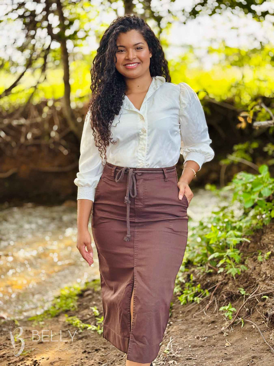 Confeccionada em sarja com elastano de alta qualidade, a Saia Sarja Marrom da Vecchi Jeans possui bolsos faca funcionais e bolsos embutidos na parte posterior, aviamentos em dourado e pesponto em cor de linha marrom. Seu comprimento midi abaixo do joelho e fenda frontal garantem maior mobilidade. O fechamento frontal em zíper e botão encapado, modelagem mais ajustada, passantes e cinto trançado na mesma cor da peça proporcionam versatilidade e estilo. Uma peça linda e na cor mais desejada do momento.