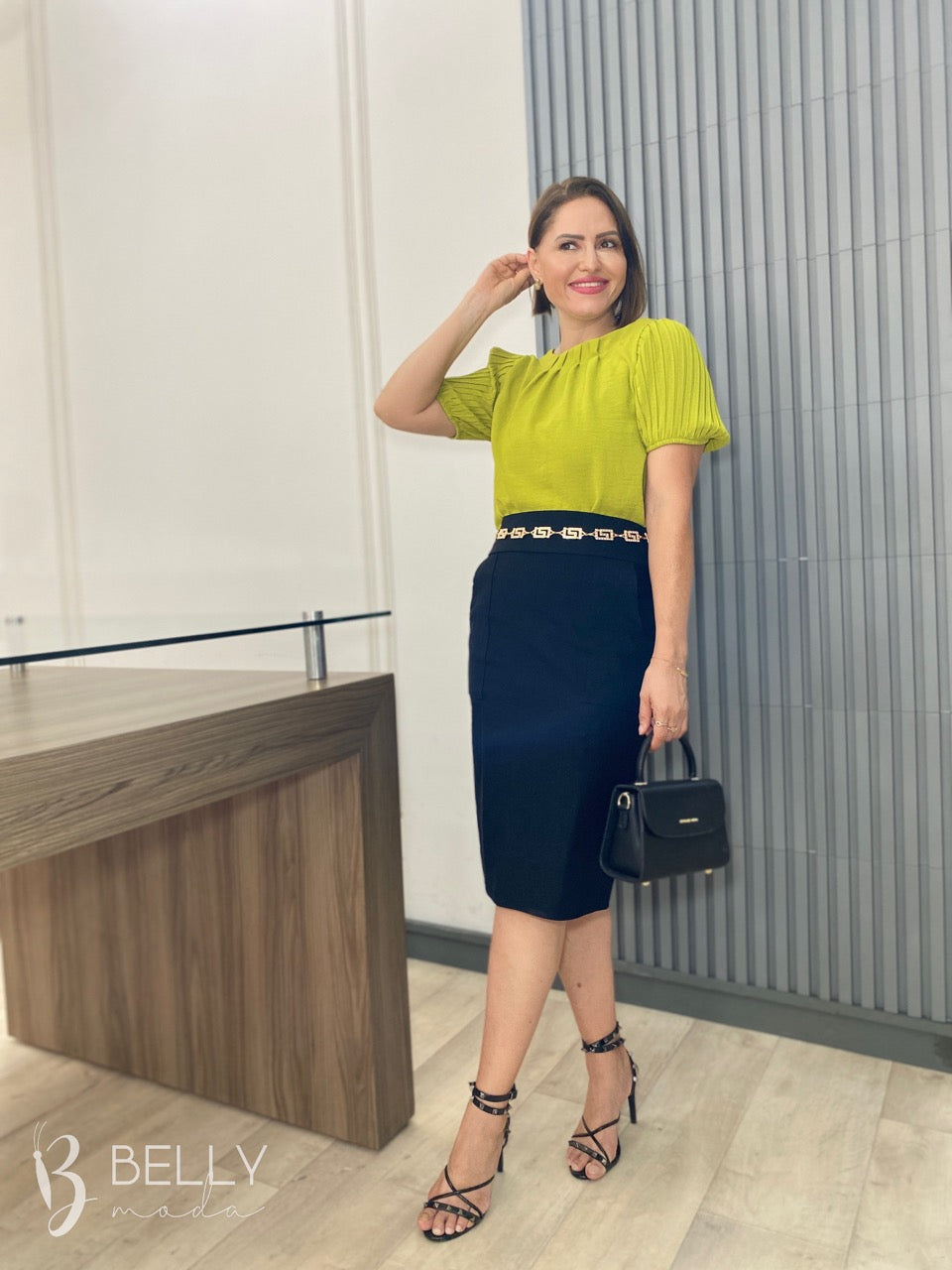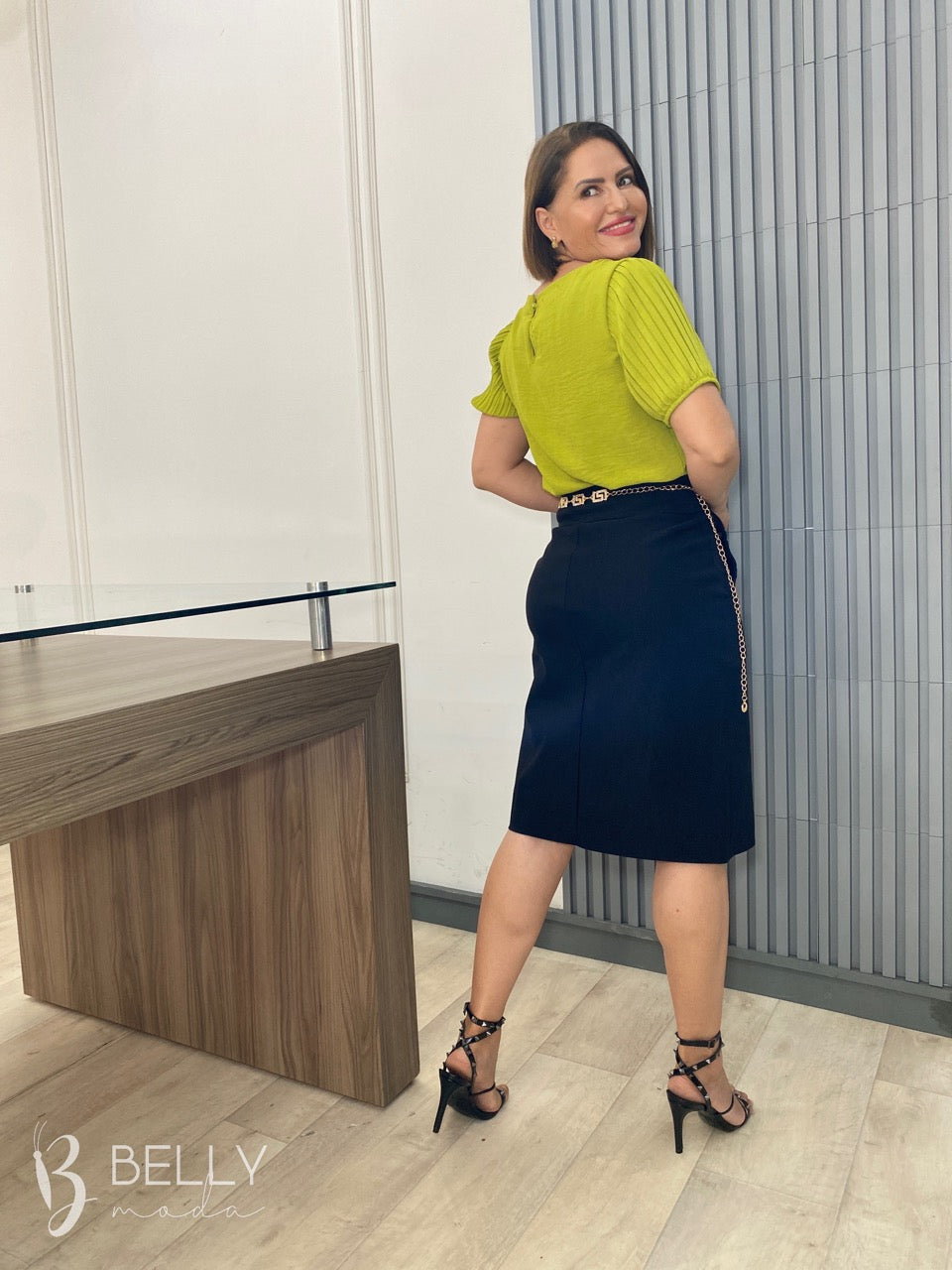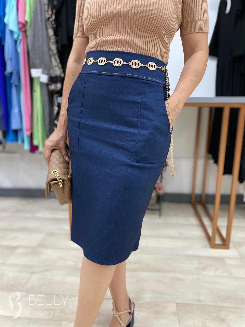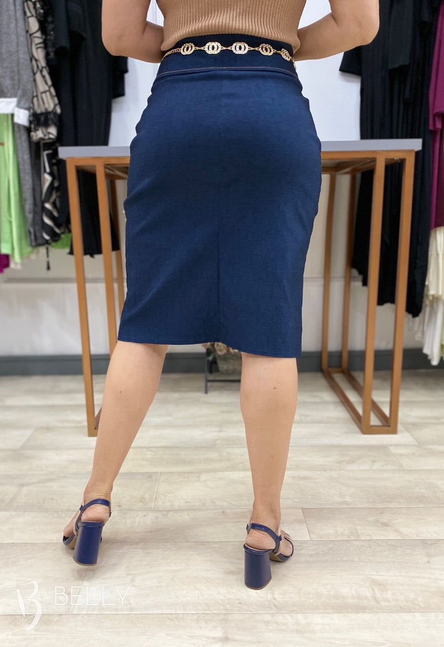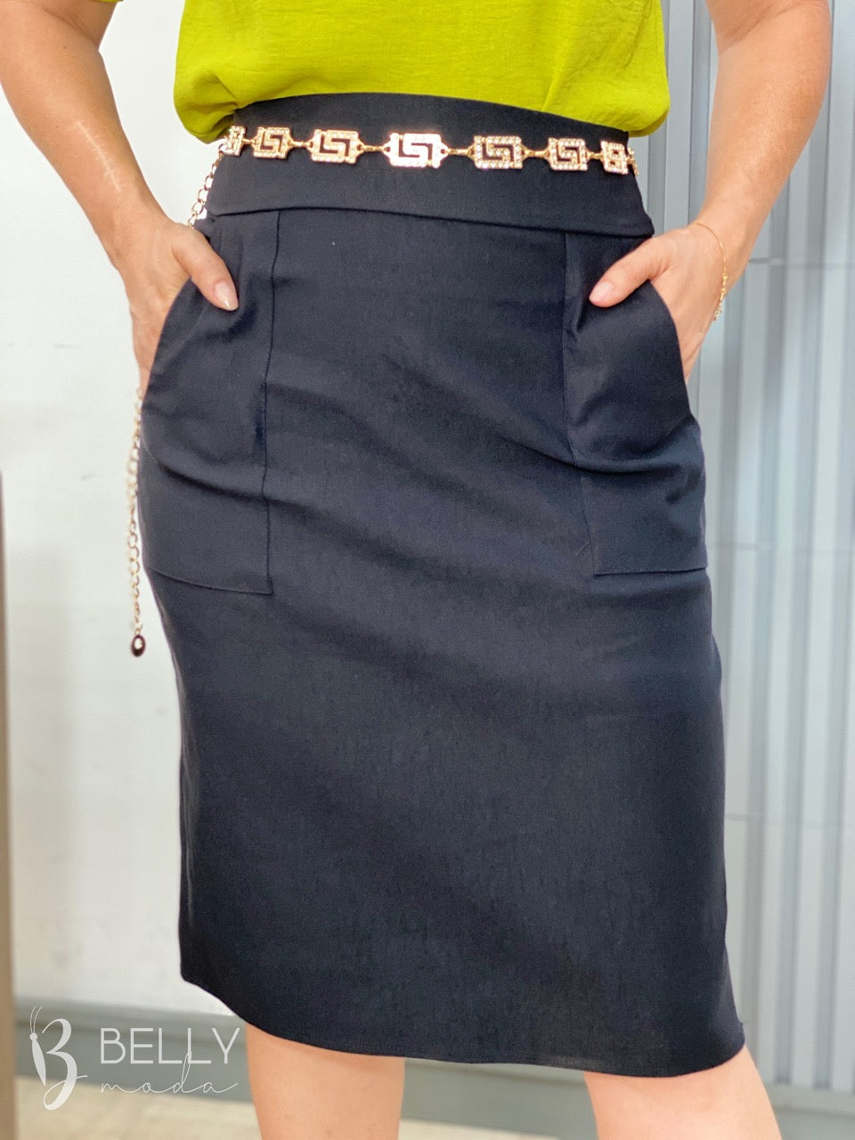 Peça tradicional e versátil, a Saia Bengaline da Belly Moda é confeccionada em bengaline com bastante elastano, garantindo conforto e um caimento impecável. Possui modelagem mais ajustada, bolso frontal, cós largo e comprimento abaixo do joelho, além de uma leve fenda na parte de trás.