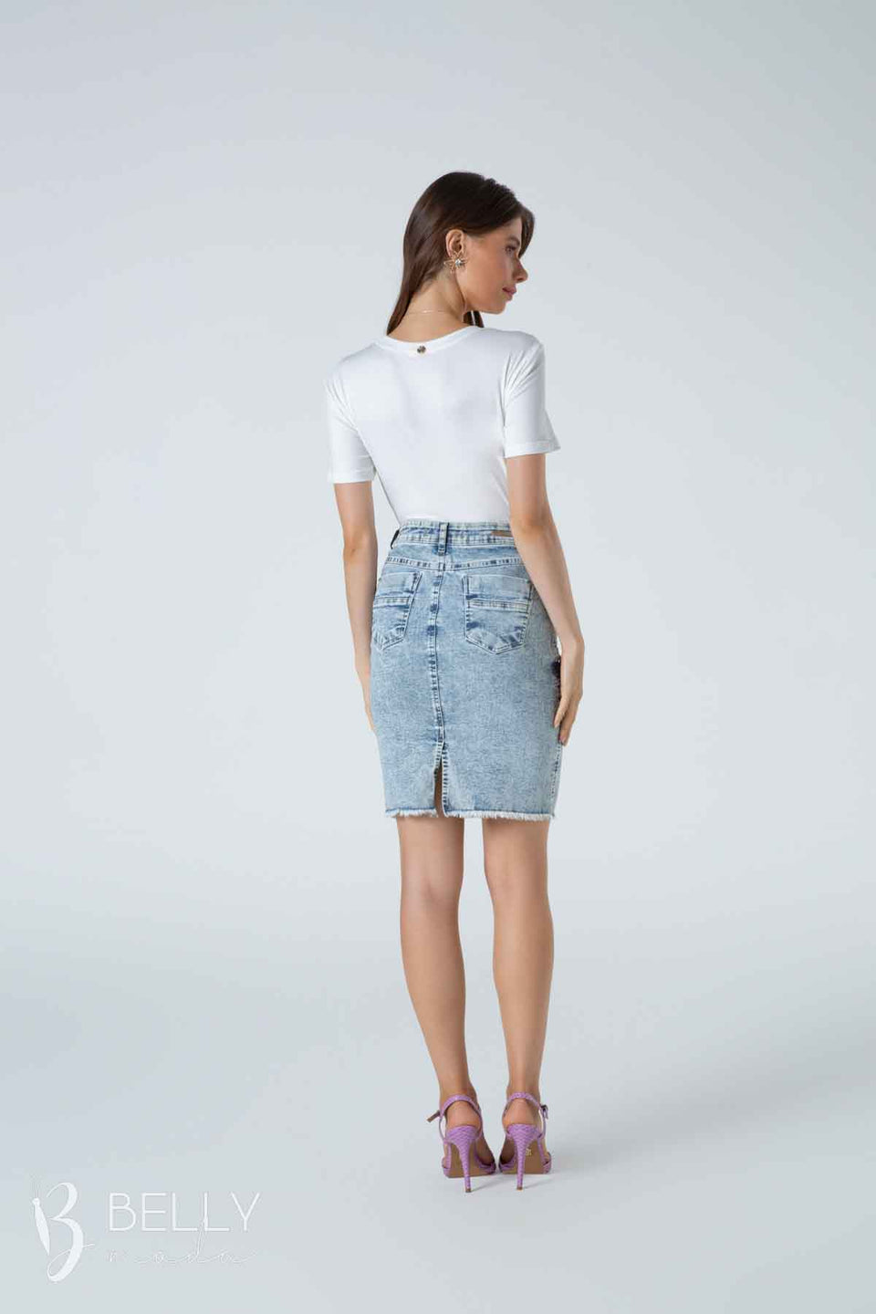 Uma saia tradicional jeans com estilo único e moderno. Possui tachas nos bolsos e laterais, fechamento frontal em botões e bolsos funcionais. O tecido de altíssima qualidade, cor de linha kake, aviamentos em banho níquel e lavanderia destroyer garantem durabilidade e um visual diferenciado.