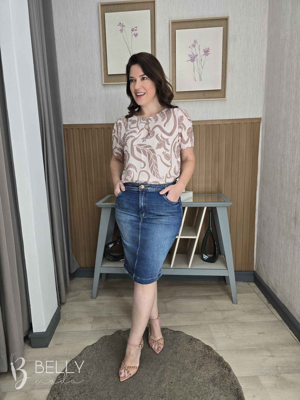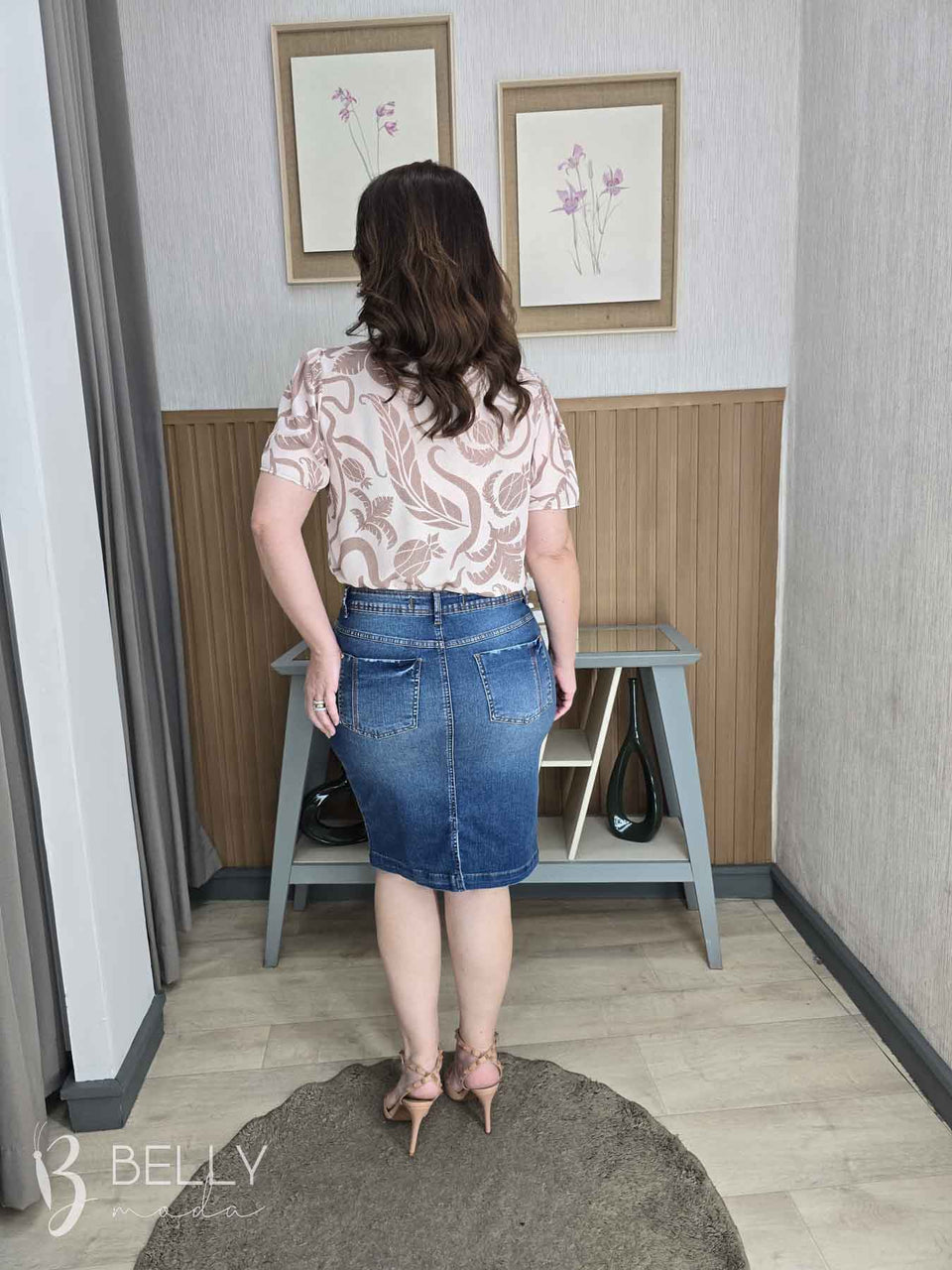 Combine a Saia Jeans Titanium com uma blusa básica para um look casual e confortável, ou com uma blusa mais sofisticada para um visual mais elegante.