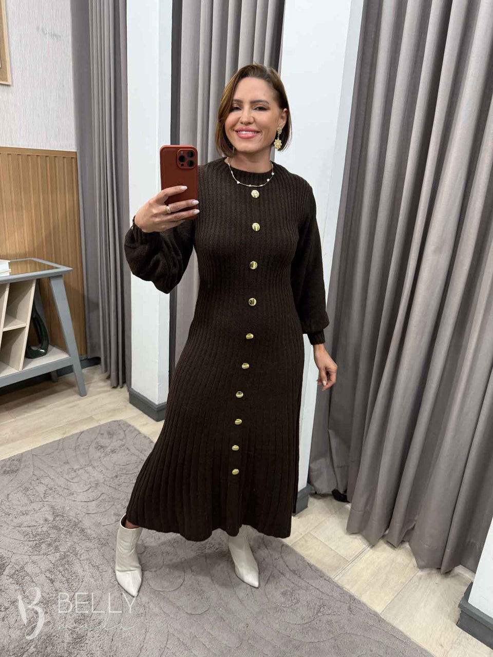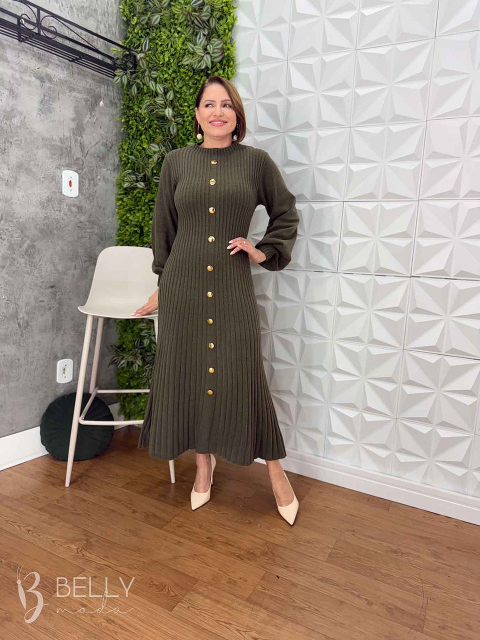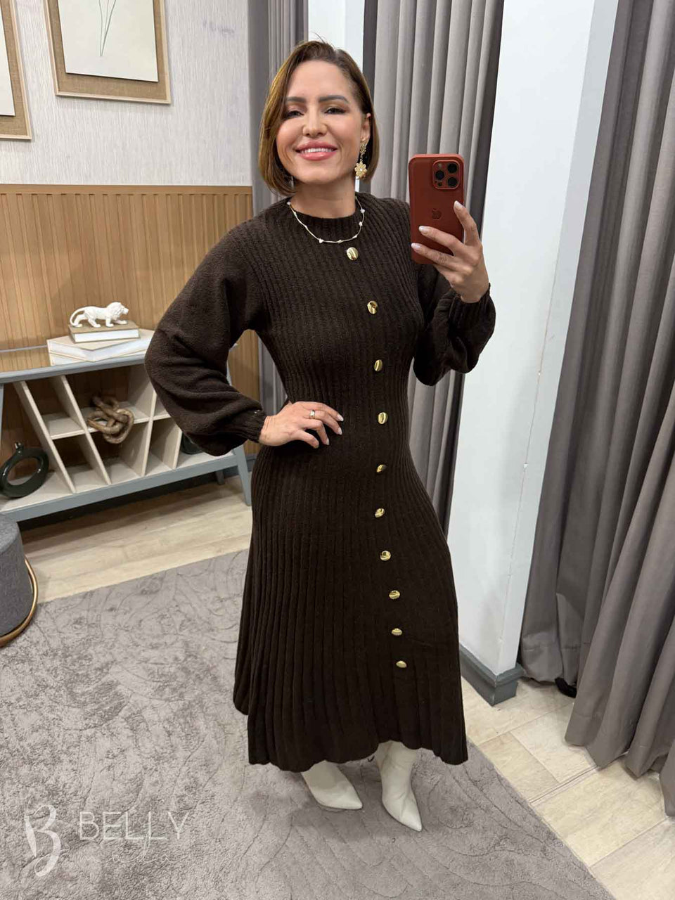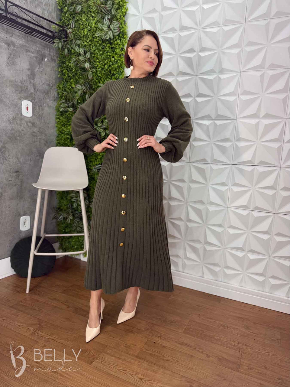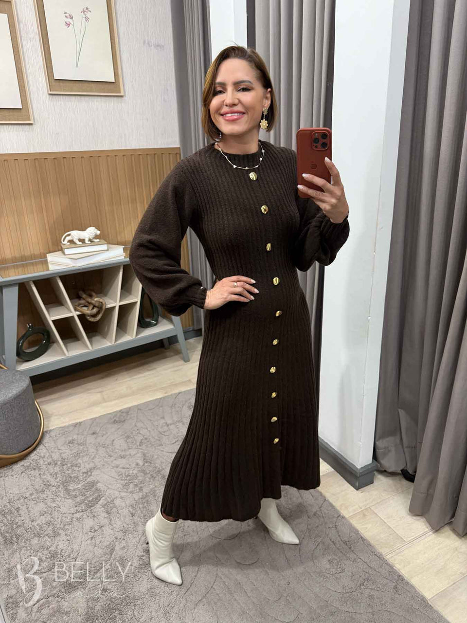Vestido Alexia em tricô mousse da Belly Moda. Com modelagem evasê, este vestido é confeccionado em tricô mousse com trama e pontos no canelado. Possui manga longa mais balone com punho max, gola careca e comprimento midi. Simplesmente lindo e perfeito para quem quer estar elegante e confortável.