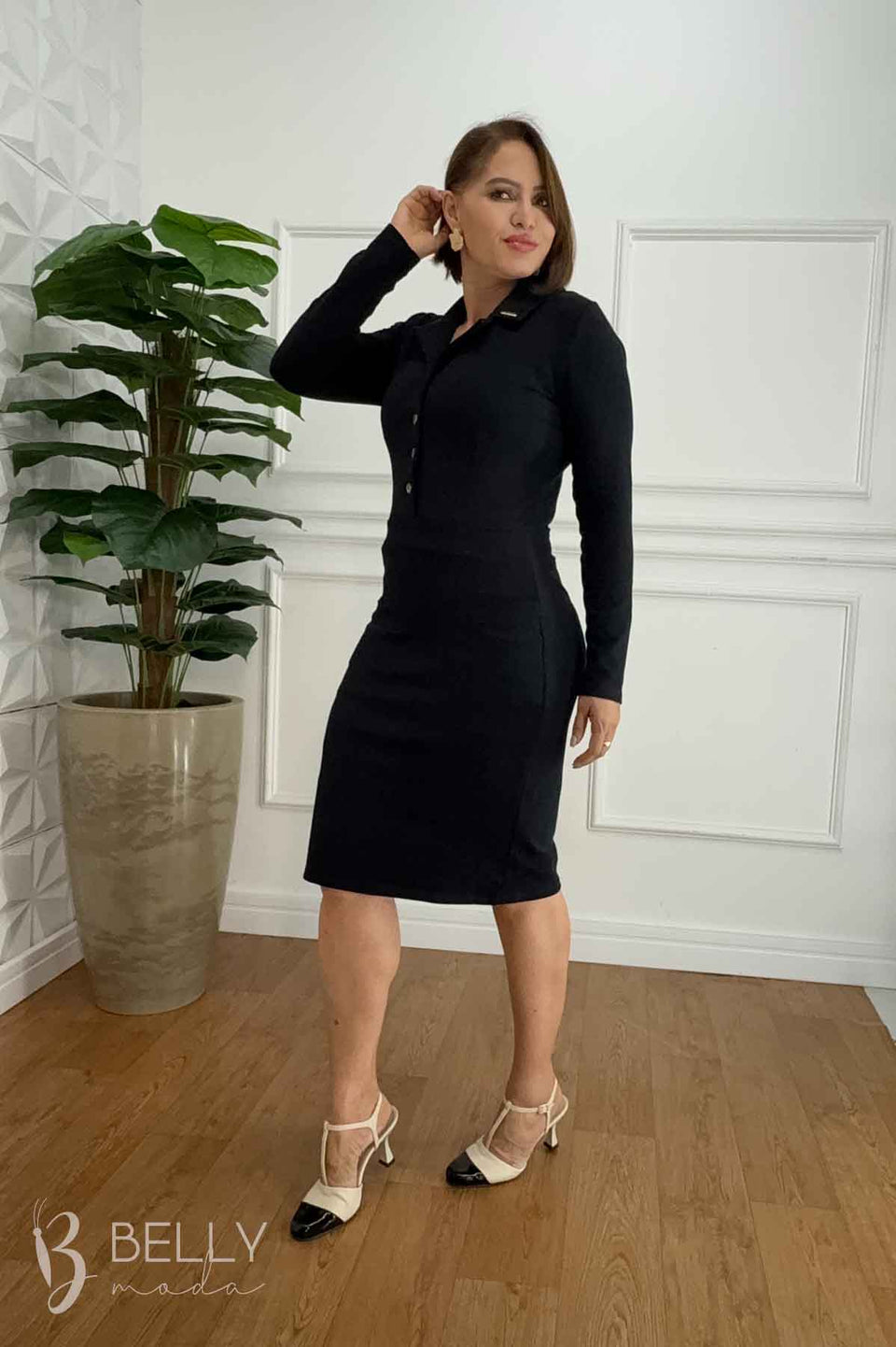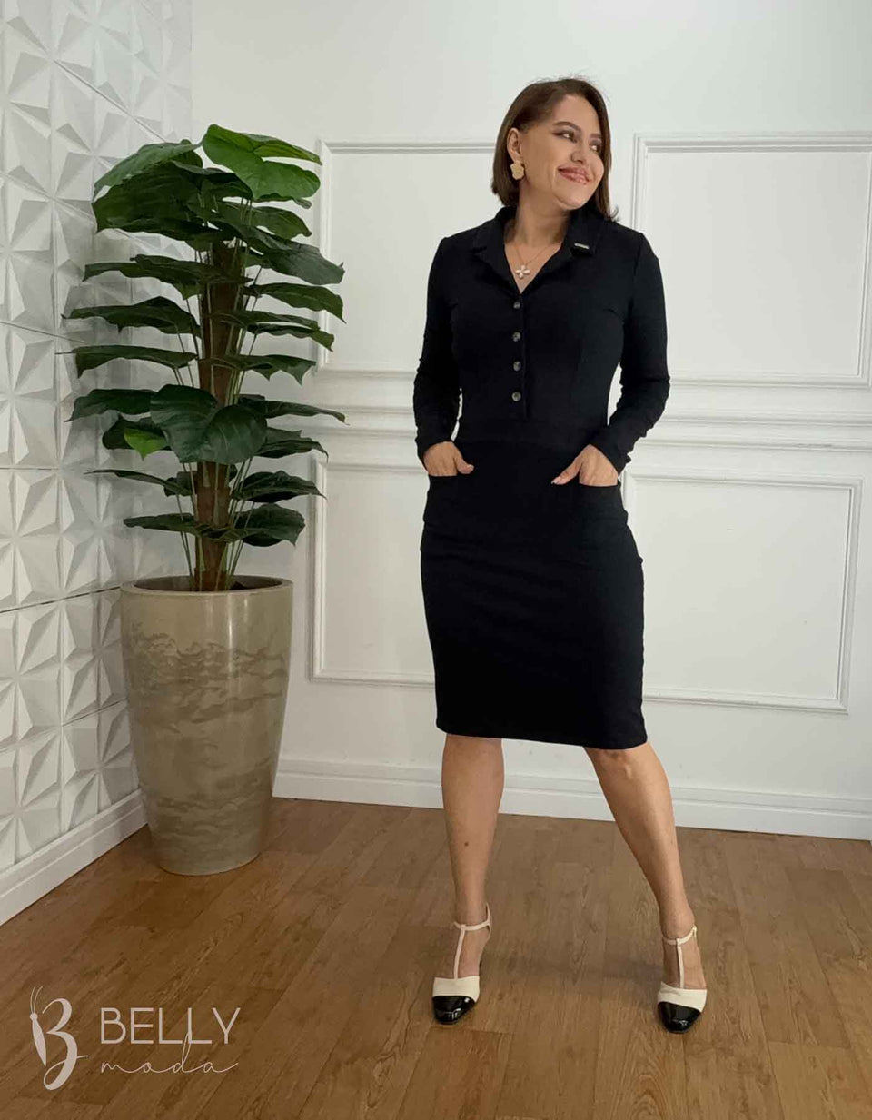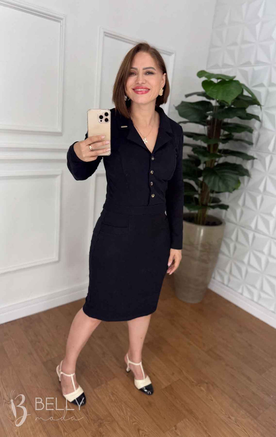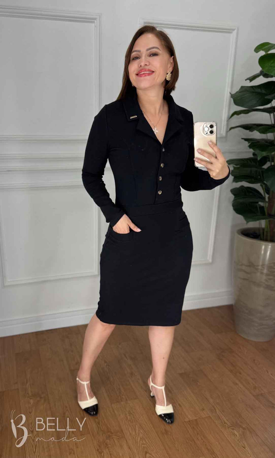 Vestido Ana Luíza Manga Longa da marca Belly Moda. Com modelagem mais ajustada, manga longa e gola de camisa com fechamento em botões frontais, este vestido é perfeito para compor looks tanto básicos quanto mais elaborados. Possui um recorte na cintura, bolsos frontais funcionais e é confeccionado em moletinho encorpado com bastante elastano, proporcionando conforto e caimento impecável. Seu comprimento fica abaixo do joelho para a modelo de 1,64m de altura, que veste tamanho P.