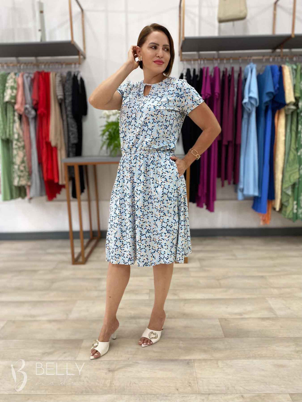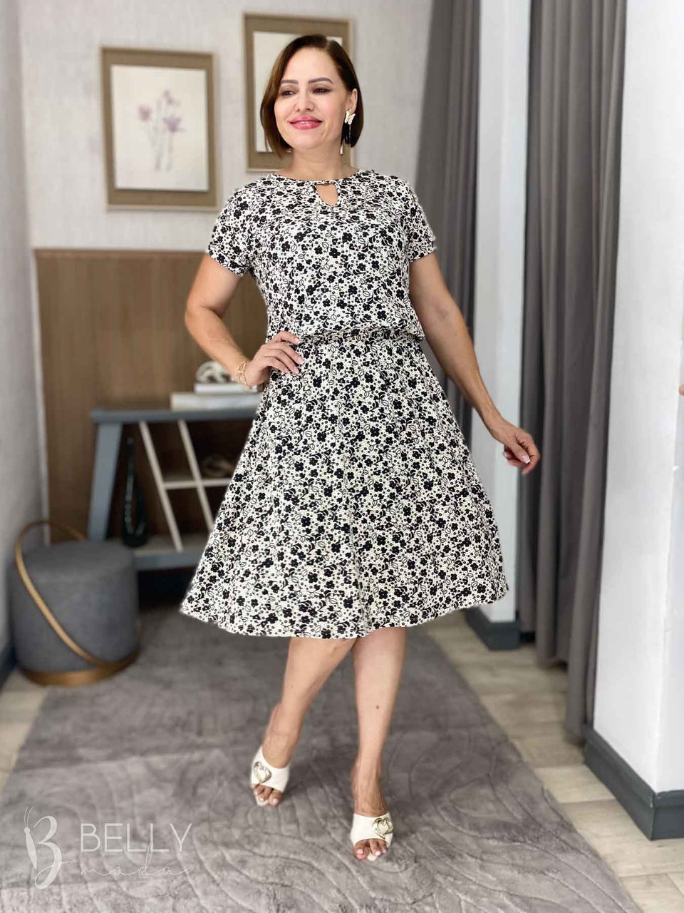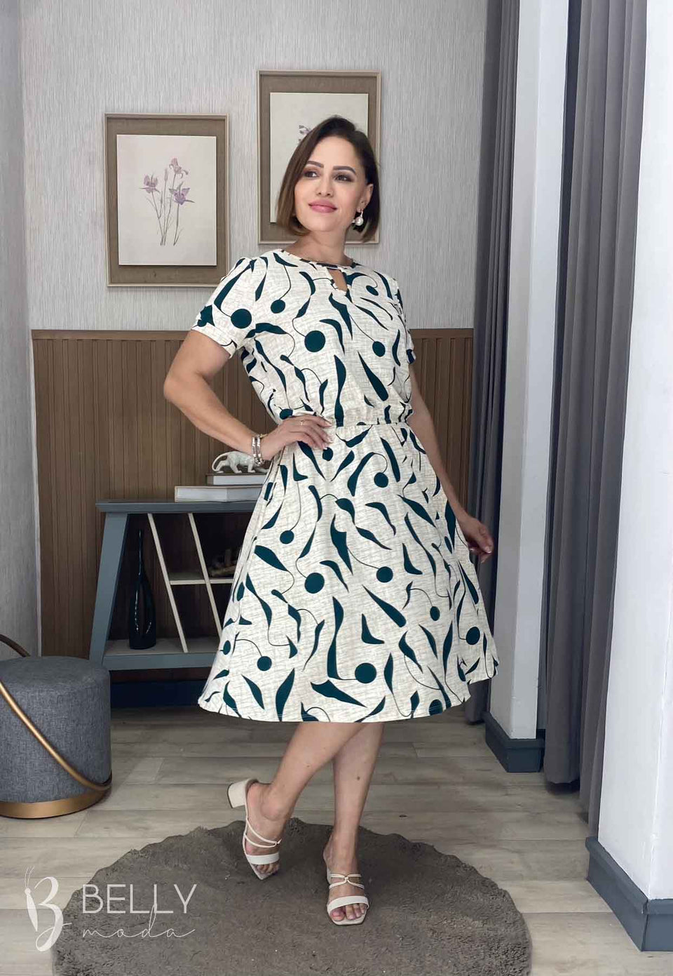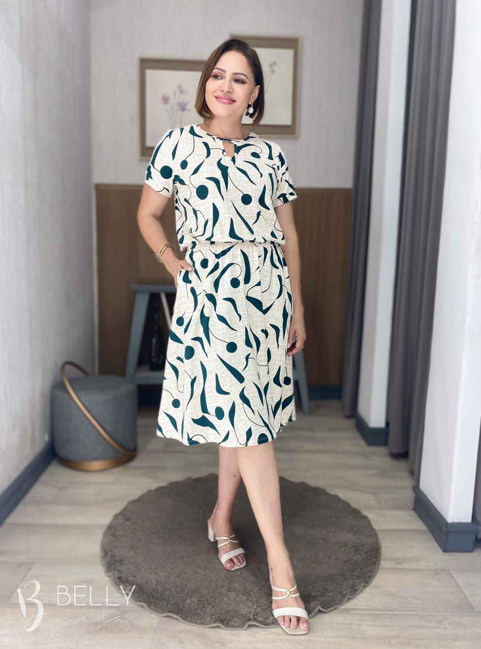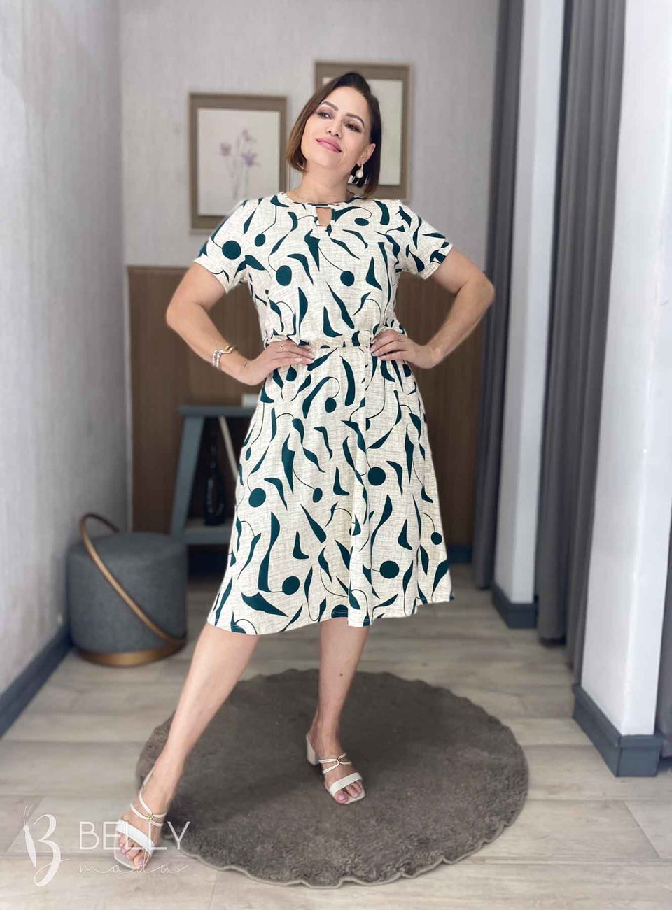 Vestido Angélica estampado, da marca Belly Moda, é uma peça elegante e versátil. Com modelagem godê, esse vestido possui manga curta, decote canoa com detalhe vazado, elástico na cintura, bolso lateral e comprimento na altura do joelho. Seu tecido de malha viscolycra premium proporciona um toque macio e suave, garantindo conforto e estilo.