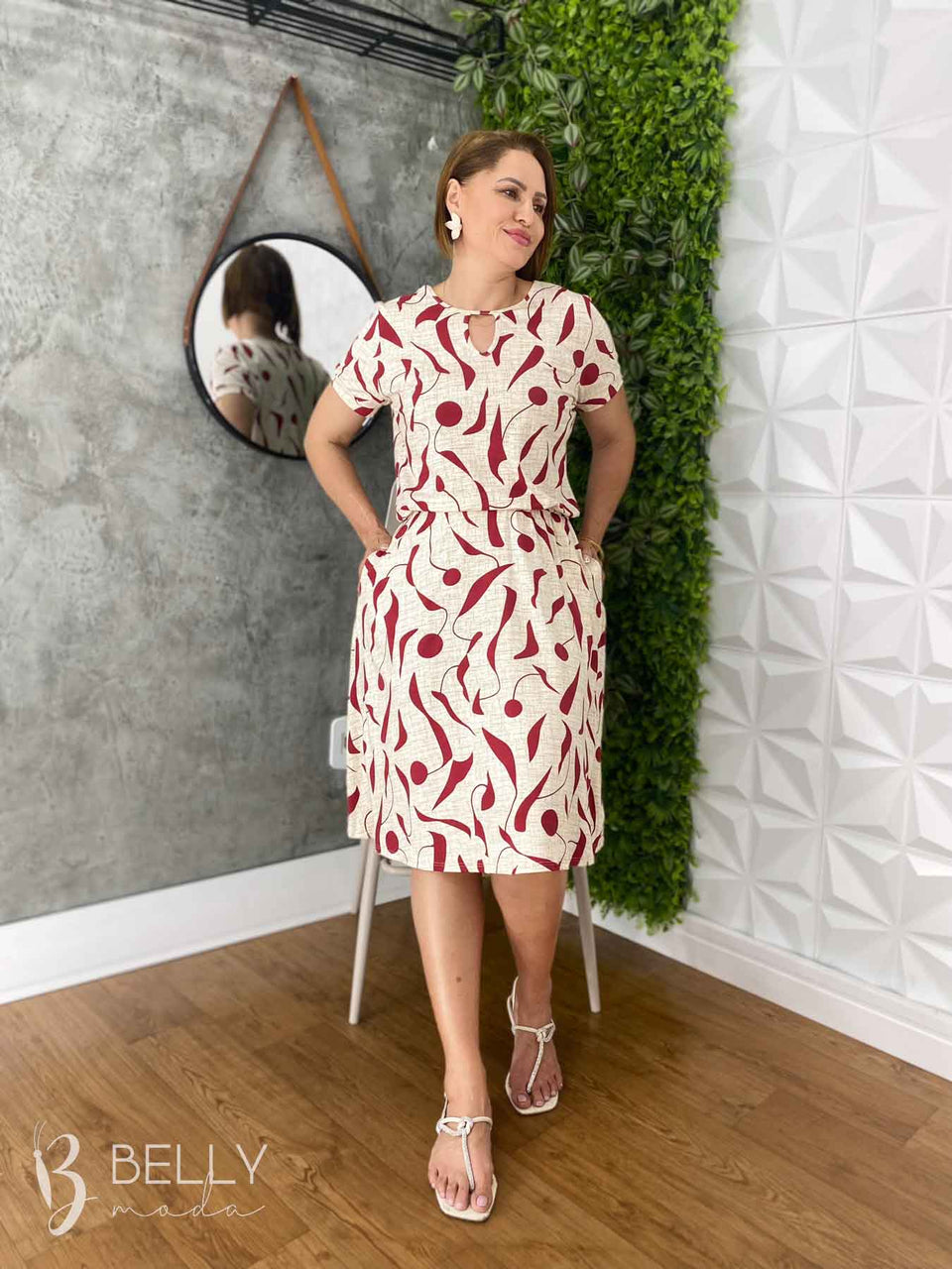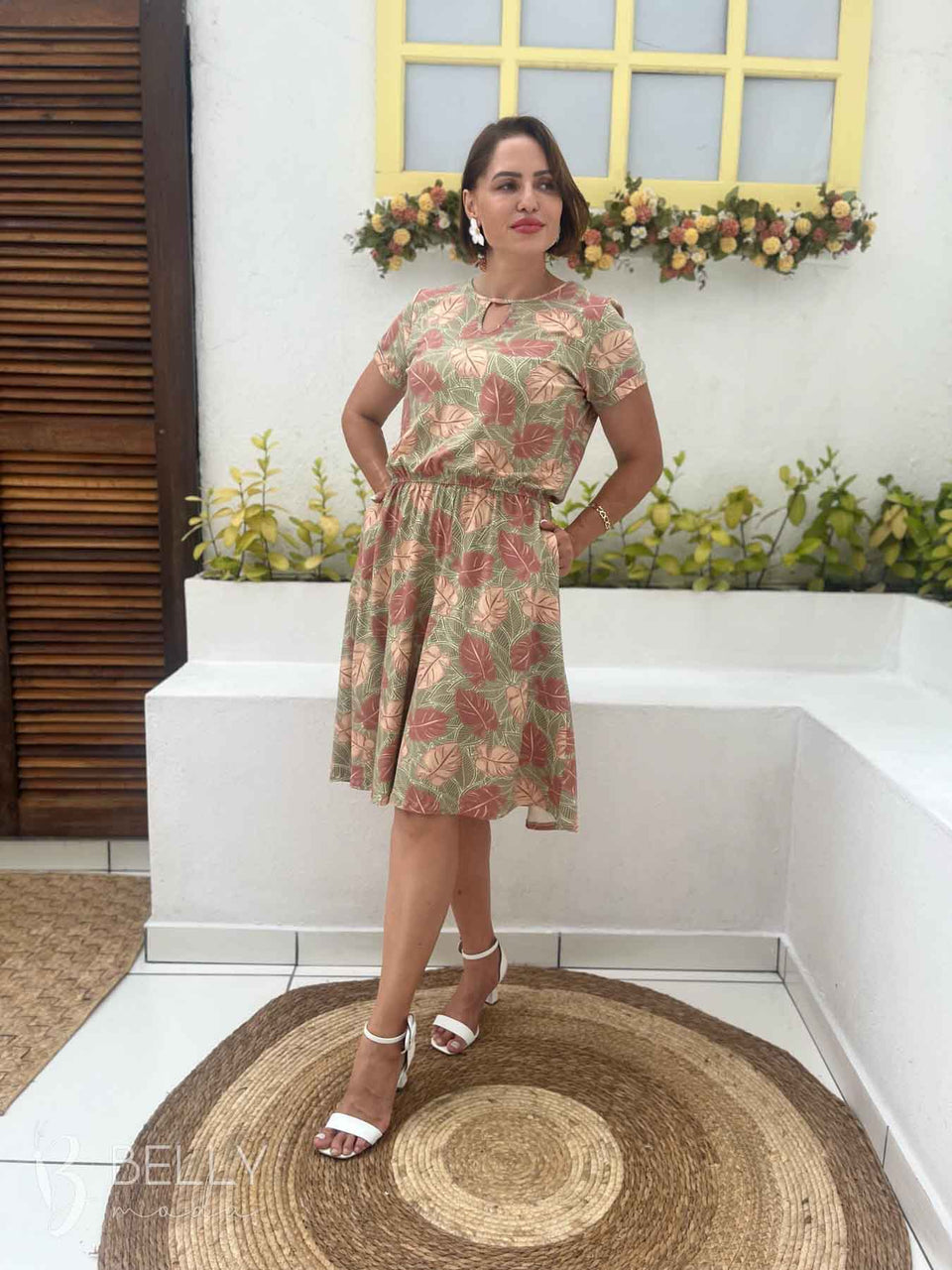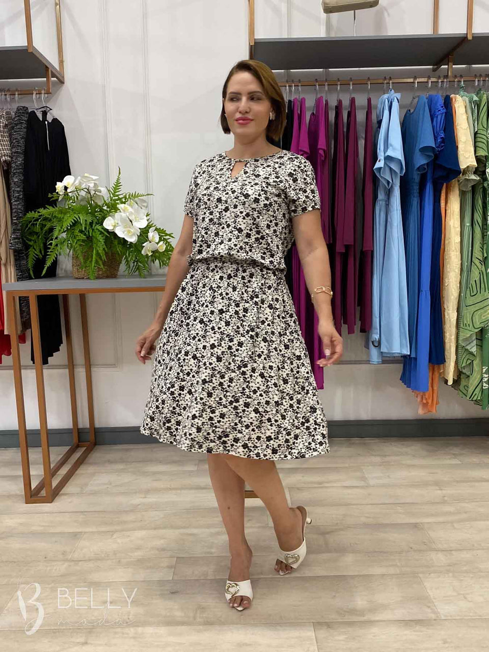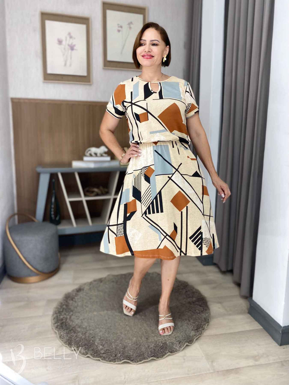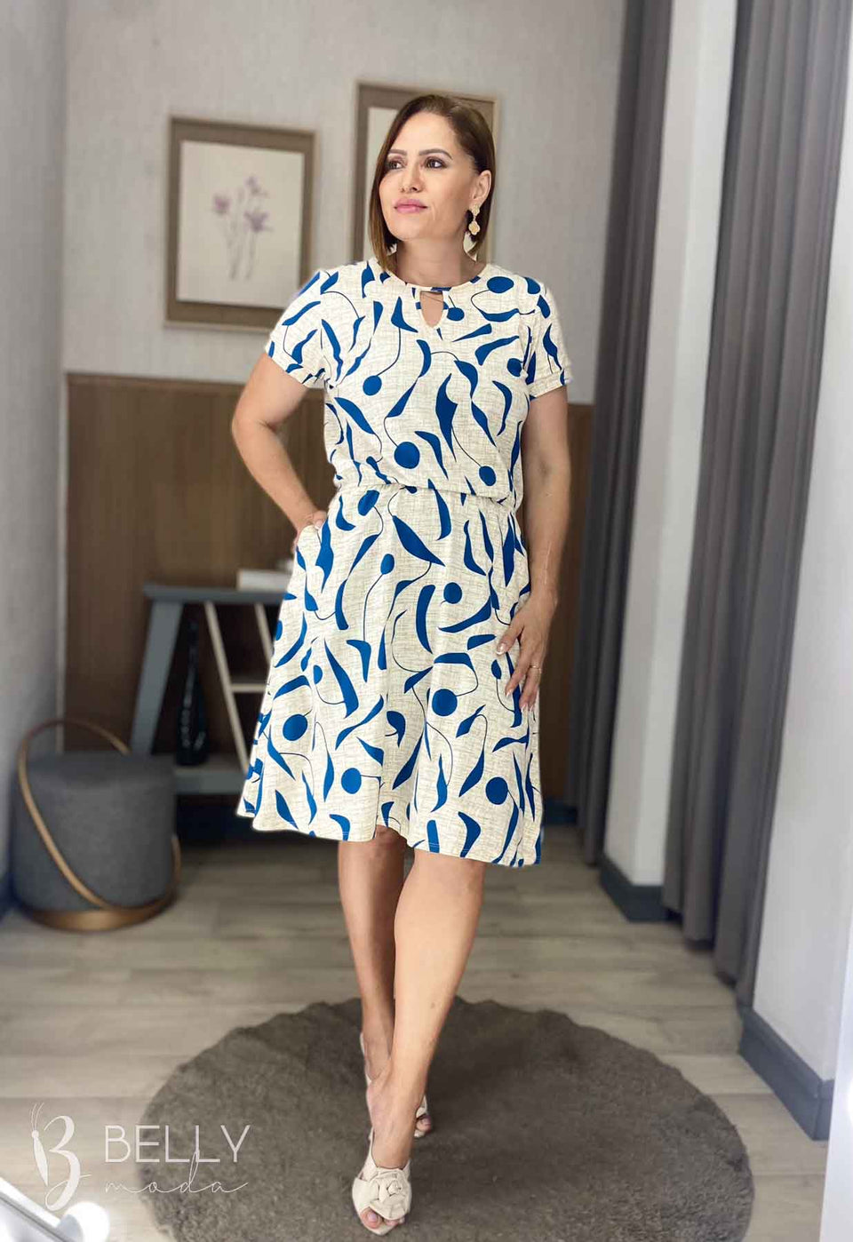 Vestido Angélica estampado, da marca Belly Moda, é uma peça elegante e versátil. Com modelagem godê, esse vestido possui manga curta, decote canoa com detalhe vazado, elástico na cintura, bolso lateral e comprimento na altura do joelho. Seu tecido de malha viscolycra premium proporciona um toque macio e suave, garantindo conforto e estilo.