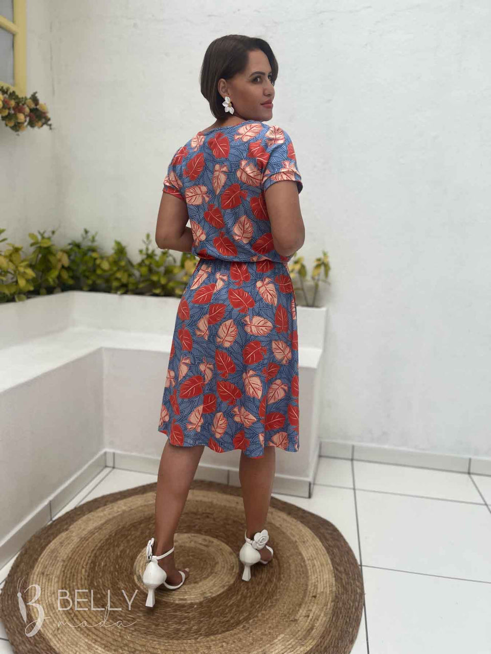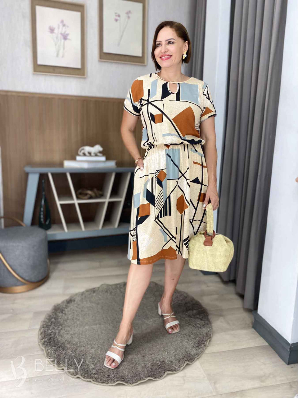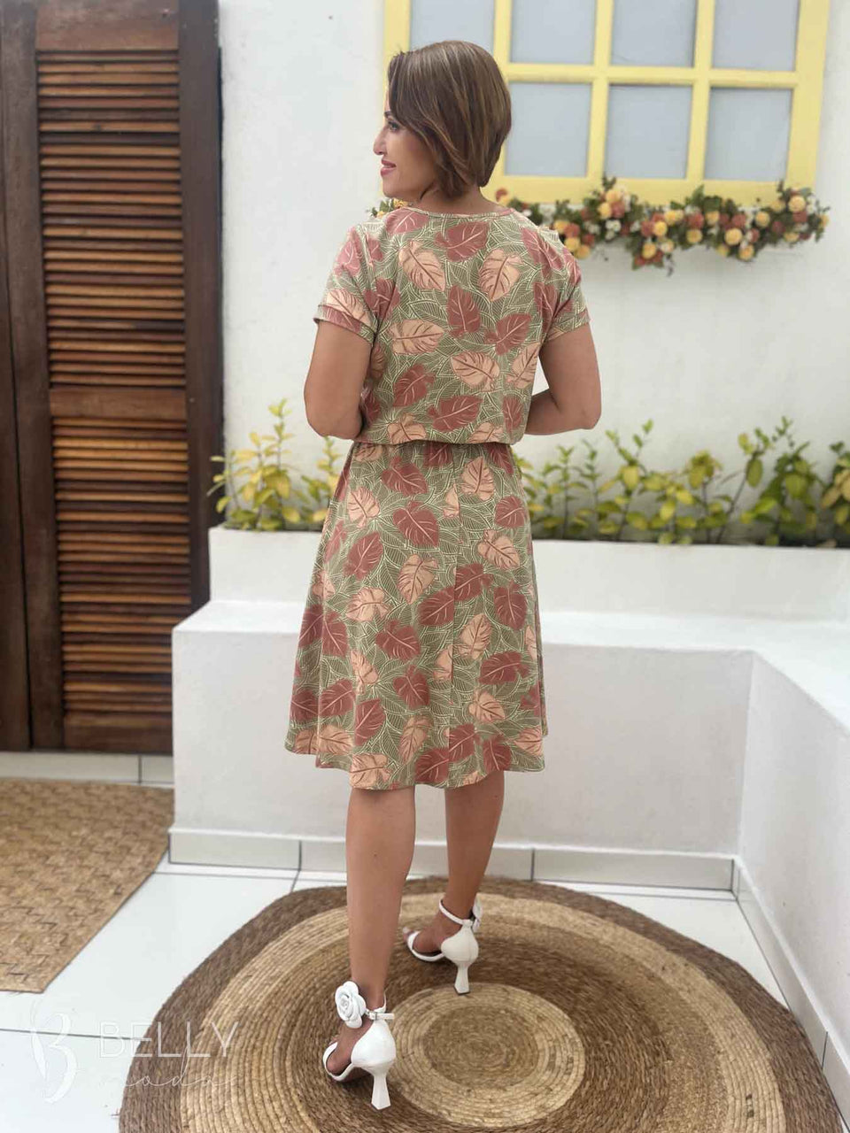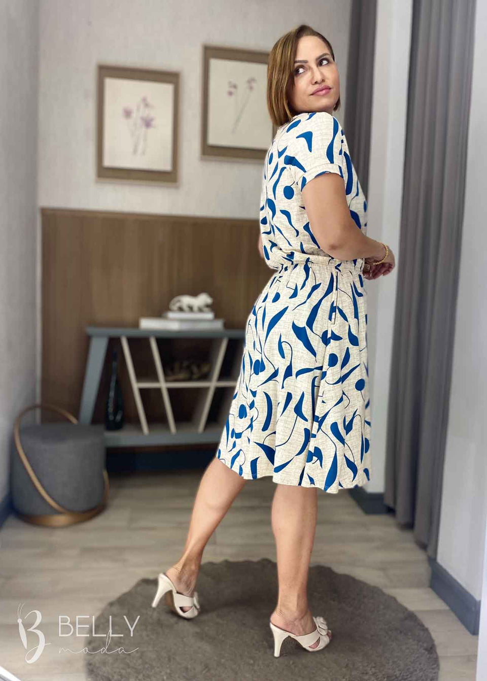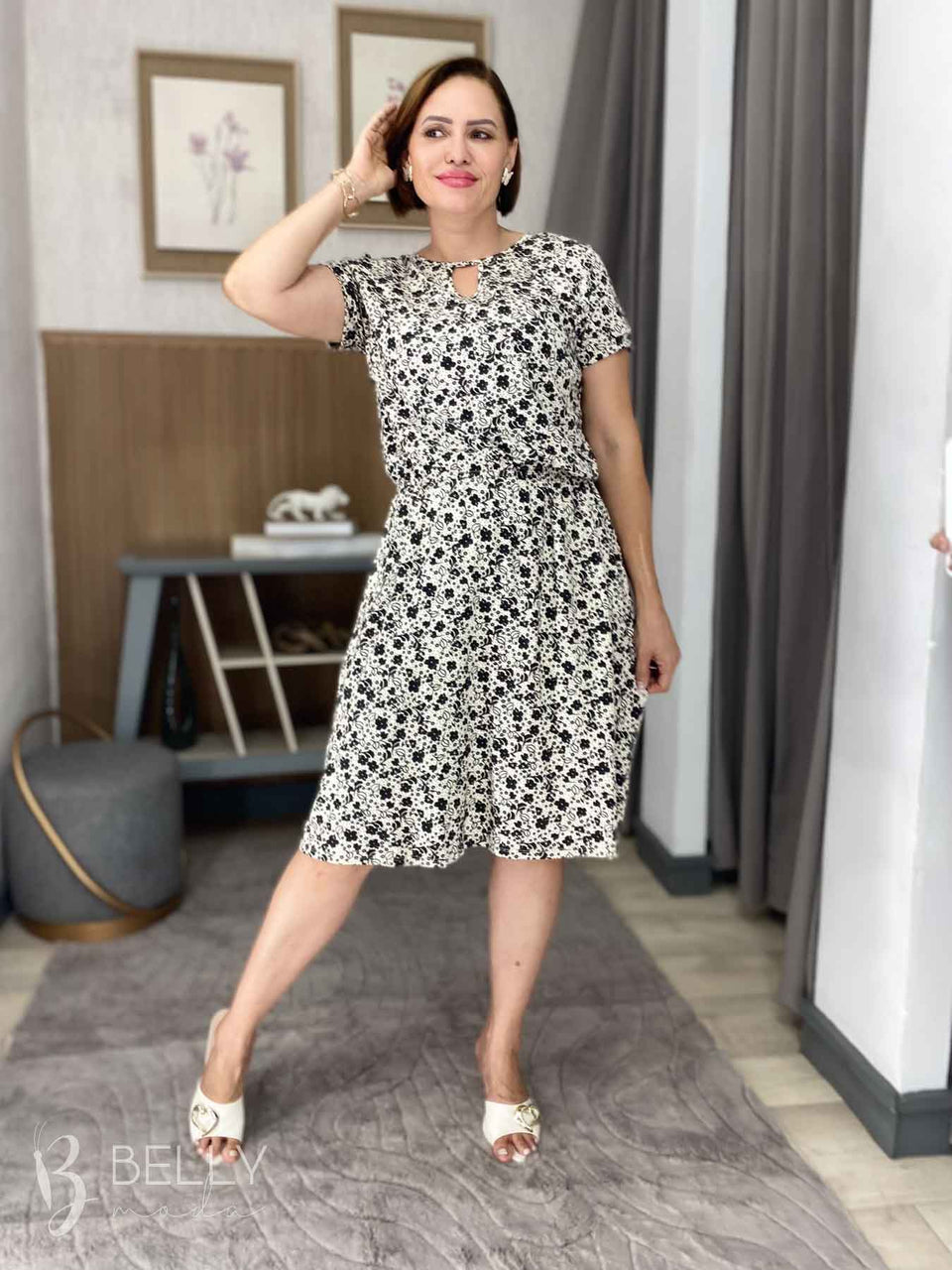 Vestido Angélica estampado, da marca Belly Moda, é uma peça elegante e versátil. Com modelagem godê, esse vestido possui manga curta, decote canoa com detalhe vazado, elástico na cintura, bolso lateral e comprimento na altura do joelho. Seu tecido de malha viscolycra premium proporciona um toque macio e suave, garantindo conforto e estilo.