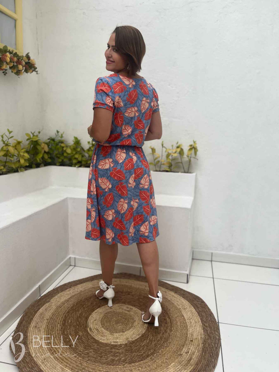 Combine o Vestido Angélica estampado com sandálias de salto para um look sofisticado ou com tênis para um visual mais casual.