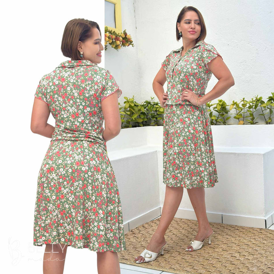 Vestido Aurora Godê Blusê da Belly Moda é uma peça elegante e versátil. Com modelagem godê, manga dupla curta e decote em "V" com gola de camisa, possui abertura frontal com fechamento em botões. O elástico na cintura proporciona o efeito blusê, enquanto a saia é fluida, possui forro e comprimento na altura do joelho.