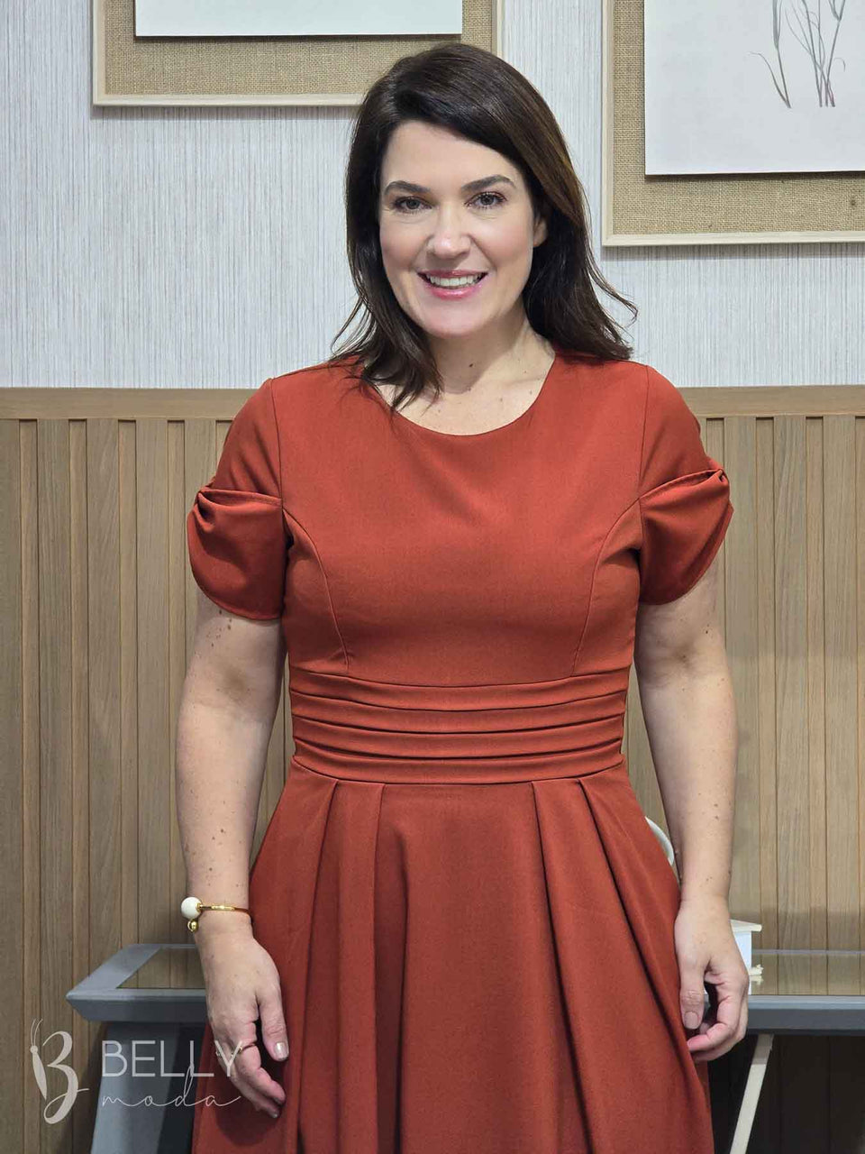 Vestido Bethy Midi - Belly Moda. Este elegante vestido midi apresenta uma modelagem godê que chega até a altura do joelho, proporcionando um caimento impecável. Possui gola careca, mangas meia manga com detalhe de laço, e uma pala com drapeado na cintura, marcando a silhueta com estilo. A saia conta com leves pregas que conferem muita fluidez ao movimento. Fechamento em zíper posterior.