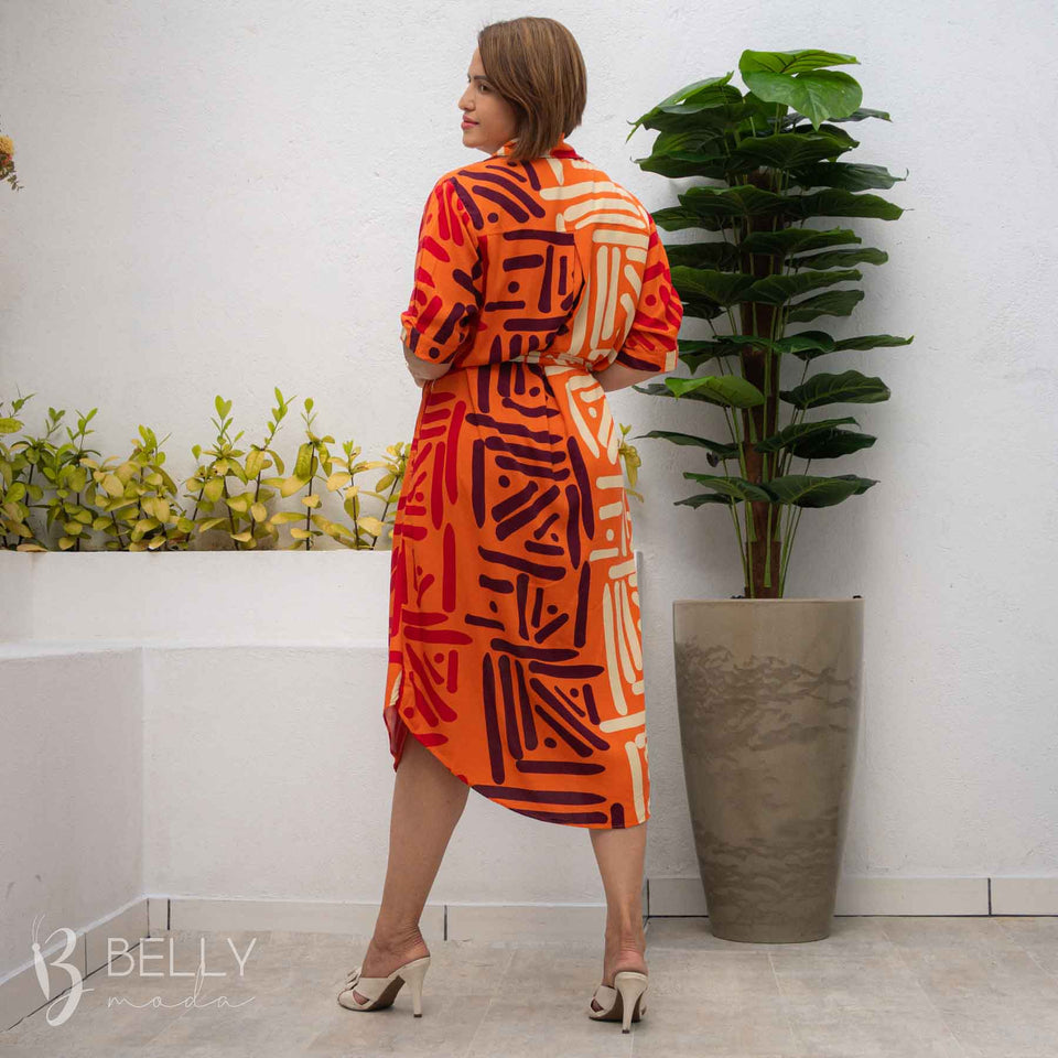 Vestido Chemisie Cláudia da marca Belly Moda, com modelagem evasê que proporciona um caimento leve e confortável. Confeccionado em viscolinho, possui manga raglã, gola tradicional, bolso lateral funcional e fechamento frontal em botões. A barra mais franzida acrescenta um toque de elegância à peça.