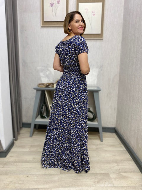 Vestido longo com saia duas Marias e lastex na cintura. Confeccionado em viscose encorpada, possui manga curta com lastex, decote ombro a ombro e cintura com elástico. Modelo não forrado, ideal para compor um look confortável e estiloso.