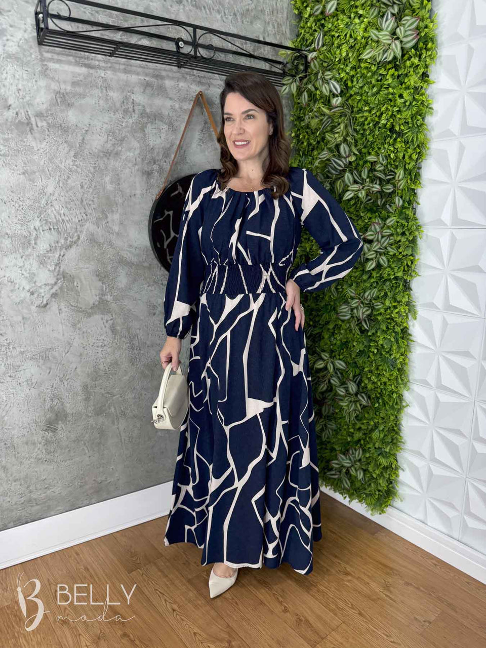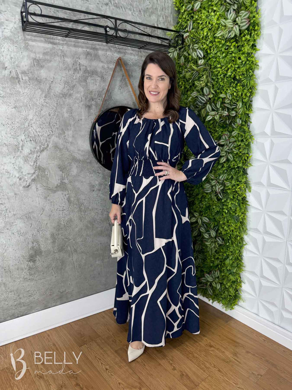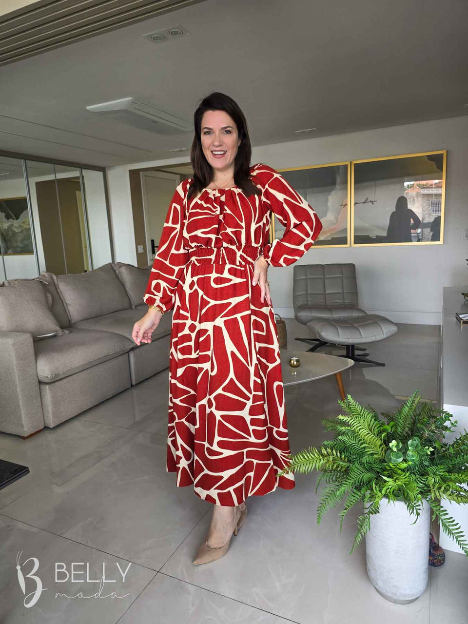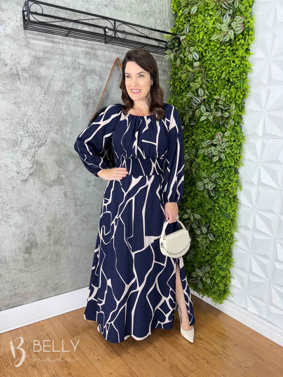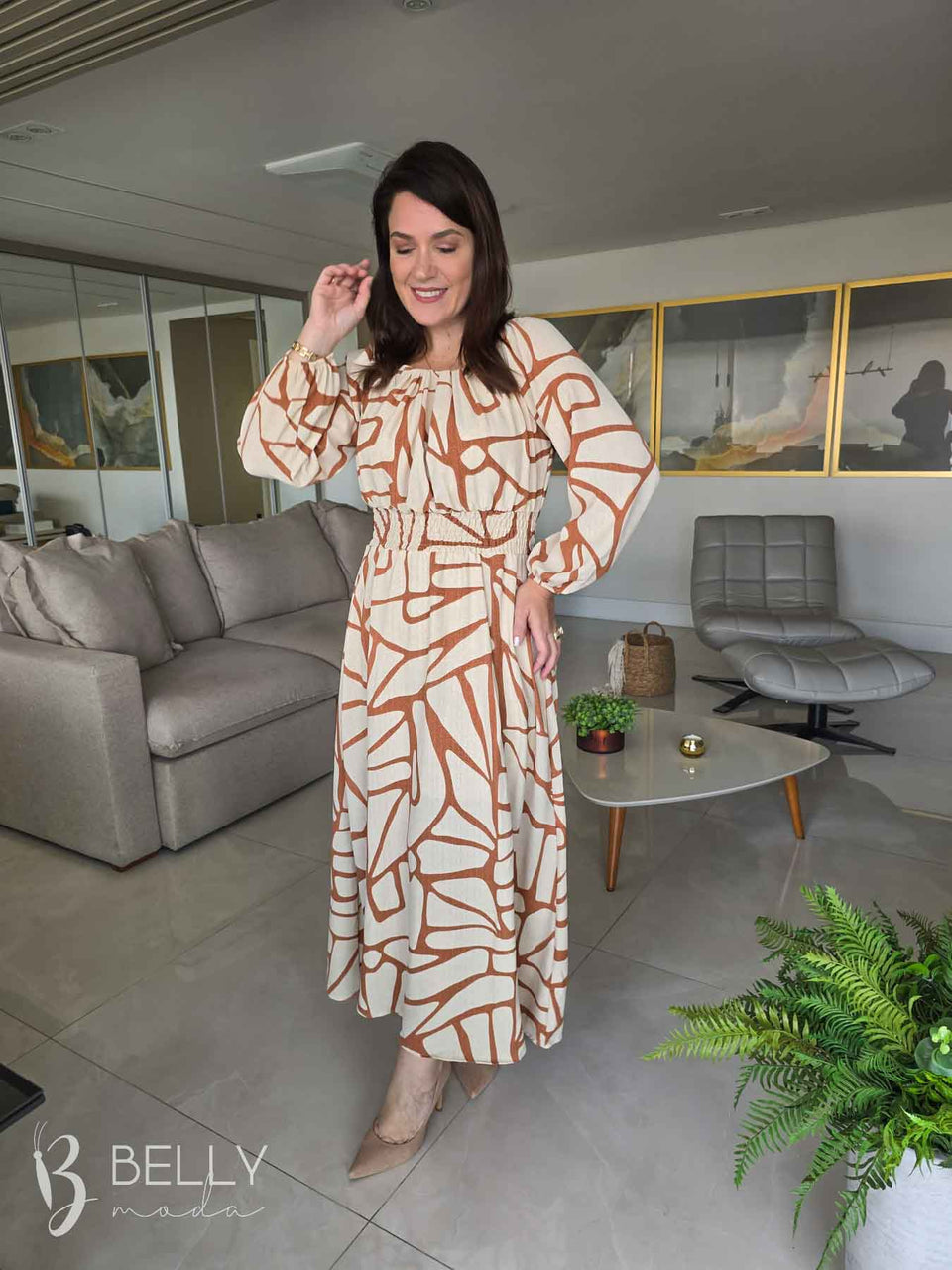 Vestido longo Cinthia da Belly Moda, confeccionado em viscolinho. Possui modelagem godê, comprimento longo, manga longa com punho em elástico, lastex na cintura, decote com drapeado e uma fenda discreta frontal. Ideal para um look elegante e confortável.