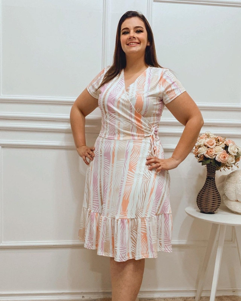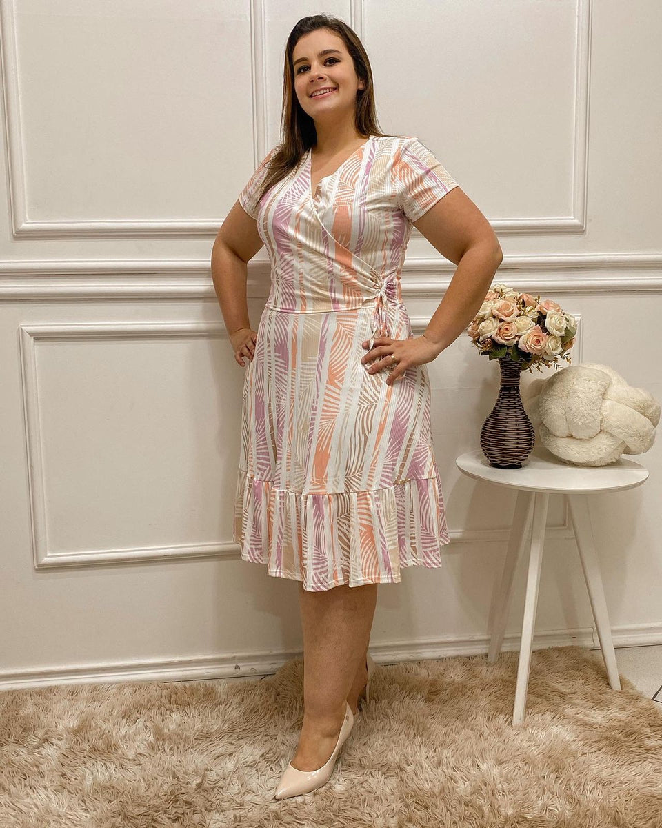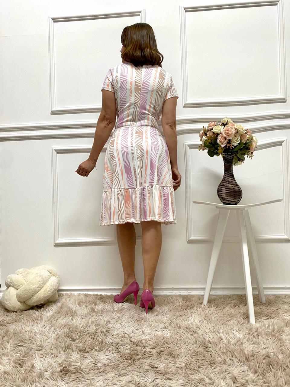 Vestido estampado em malha canelada, da marca Dazul Moda Evangélica. Possui transpasse superior com detalhe de laço, manga curta e saia forrada com modelagem evasê e babado, garantindo um caimento elegante e feminino.