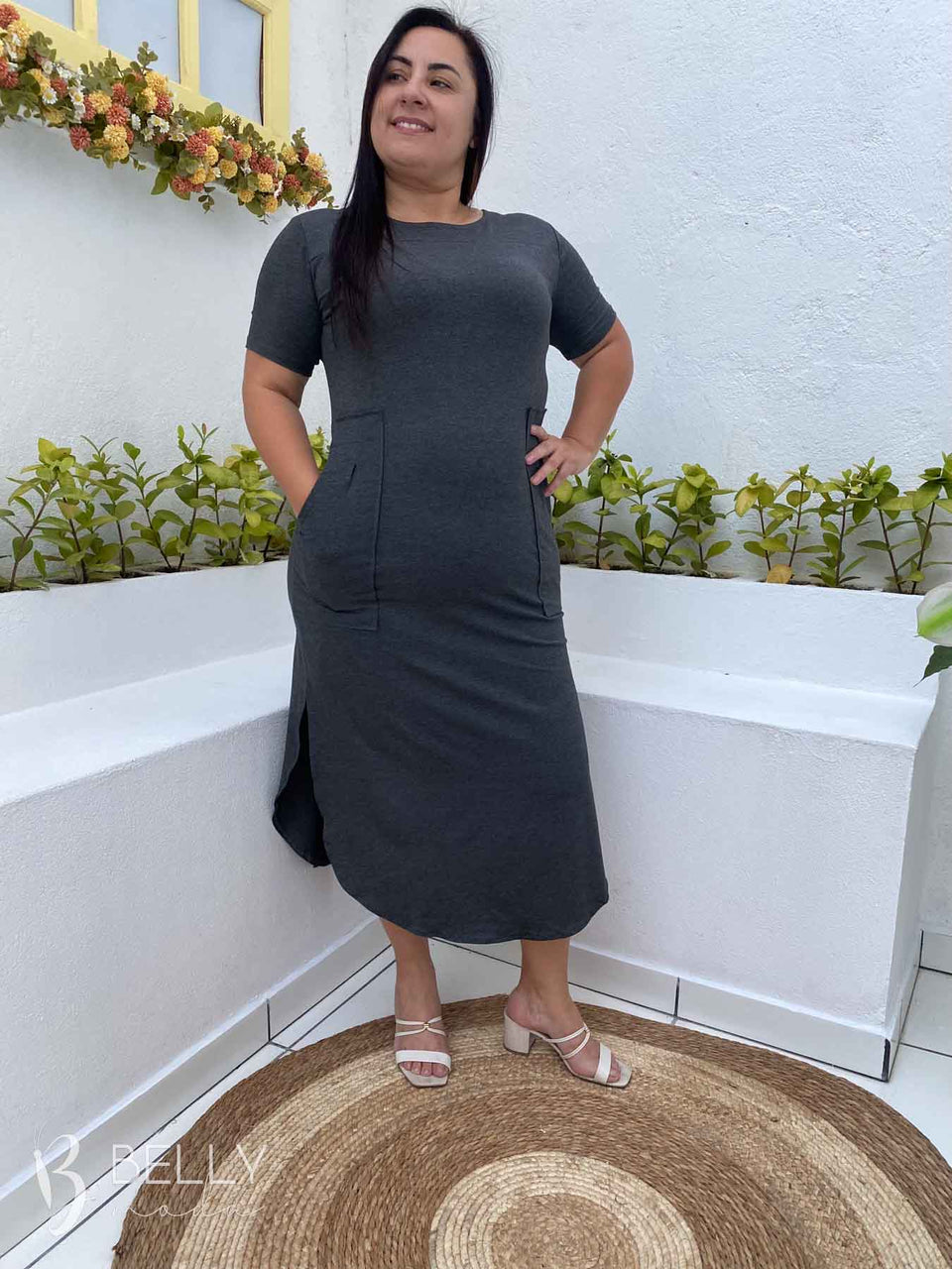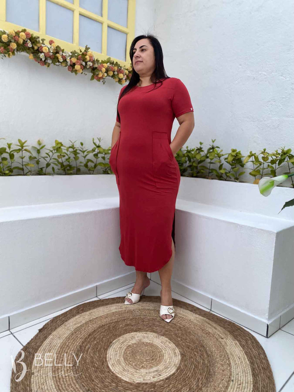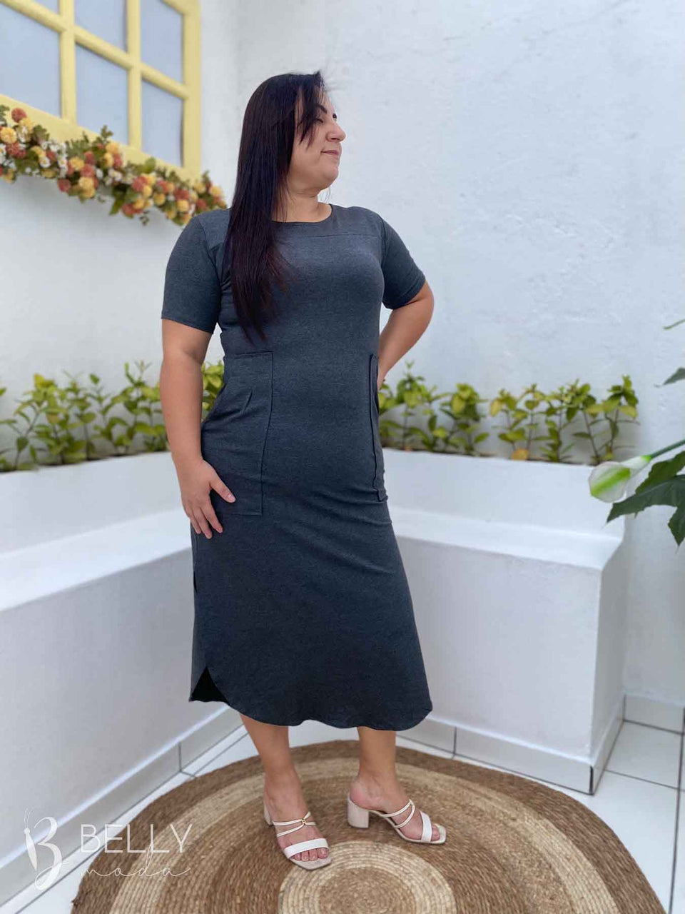 Vestido Gilmara Midi da marca Belly Moda, confeccionado em malha viscolycra de toque macio e suave. Possui modelagem soltinha, meia manga, recorte na região do colo, bolso frontal funcional, comprimento midi e barra com leve fenda lateral. Ideal para te acompanhar em diversas ocasiões com muito conforto e estilo.