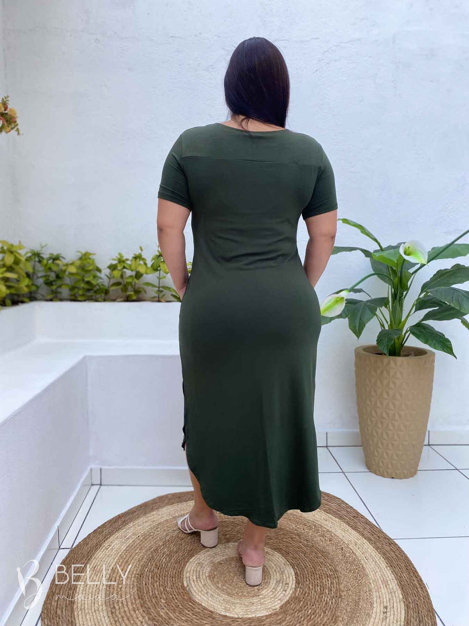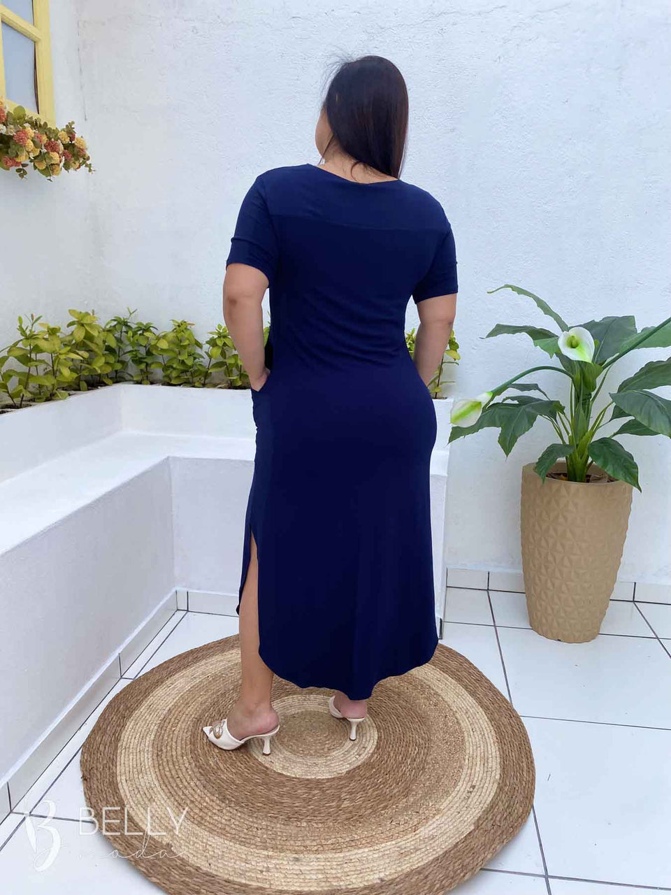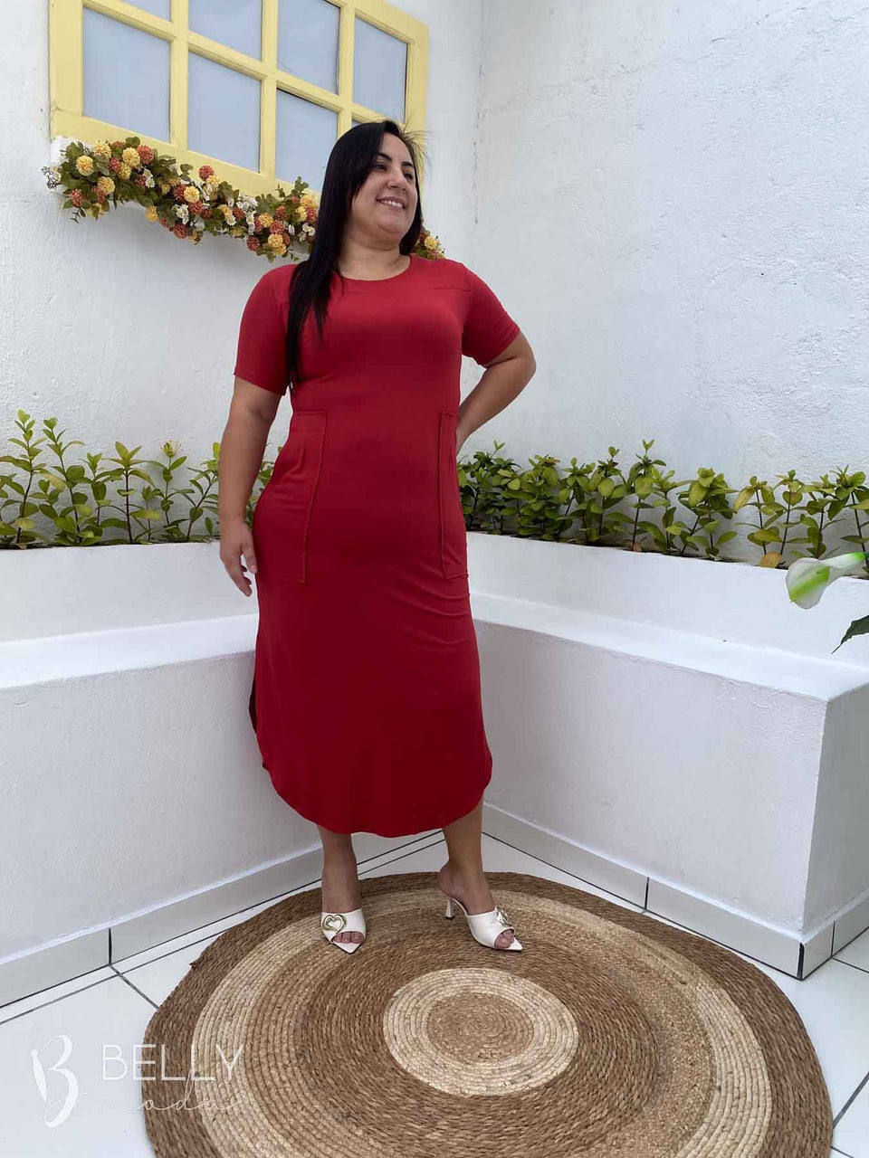Vestido Gilmara Midi da marca Belly Moda, confeccionado em malha viscolycra de toque macio e suave. Possui modelagem soltinha, meia manga, recorte na região do colo, bolso frontal funcional, comprimento midi e barra com leve fenda lateral. Ideal para te acompanhar em diversas ocasiões com muito conforto e estilo.