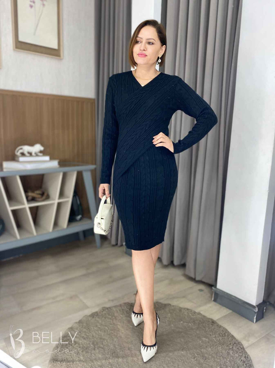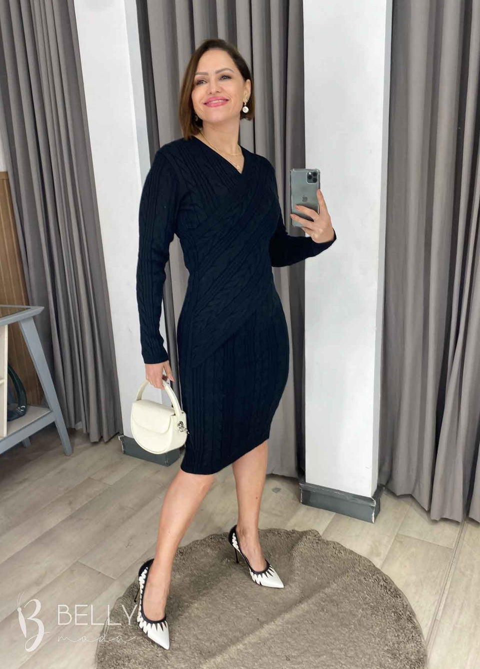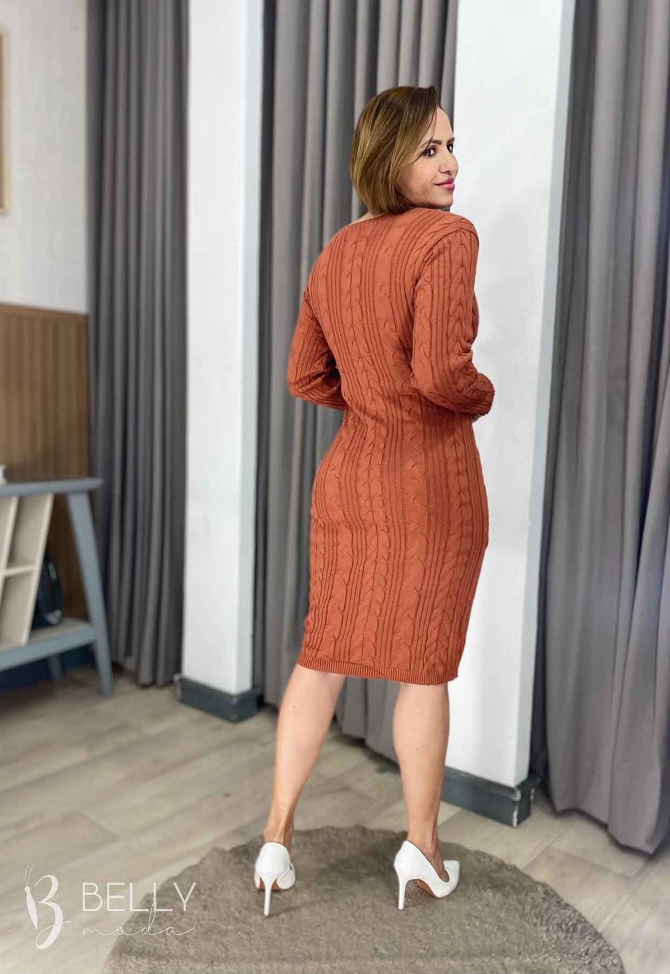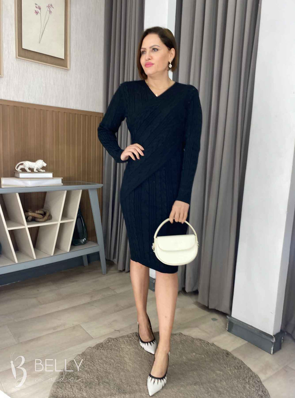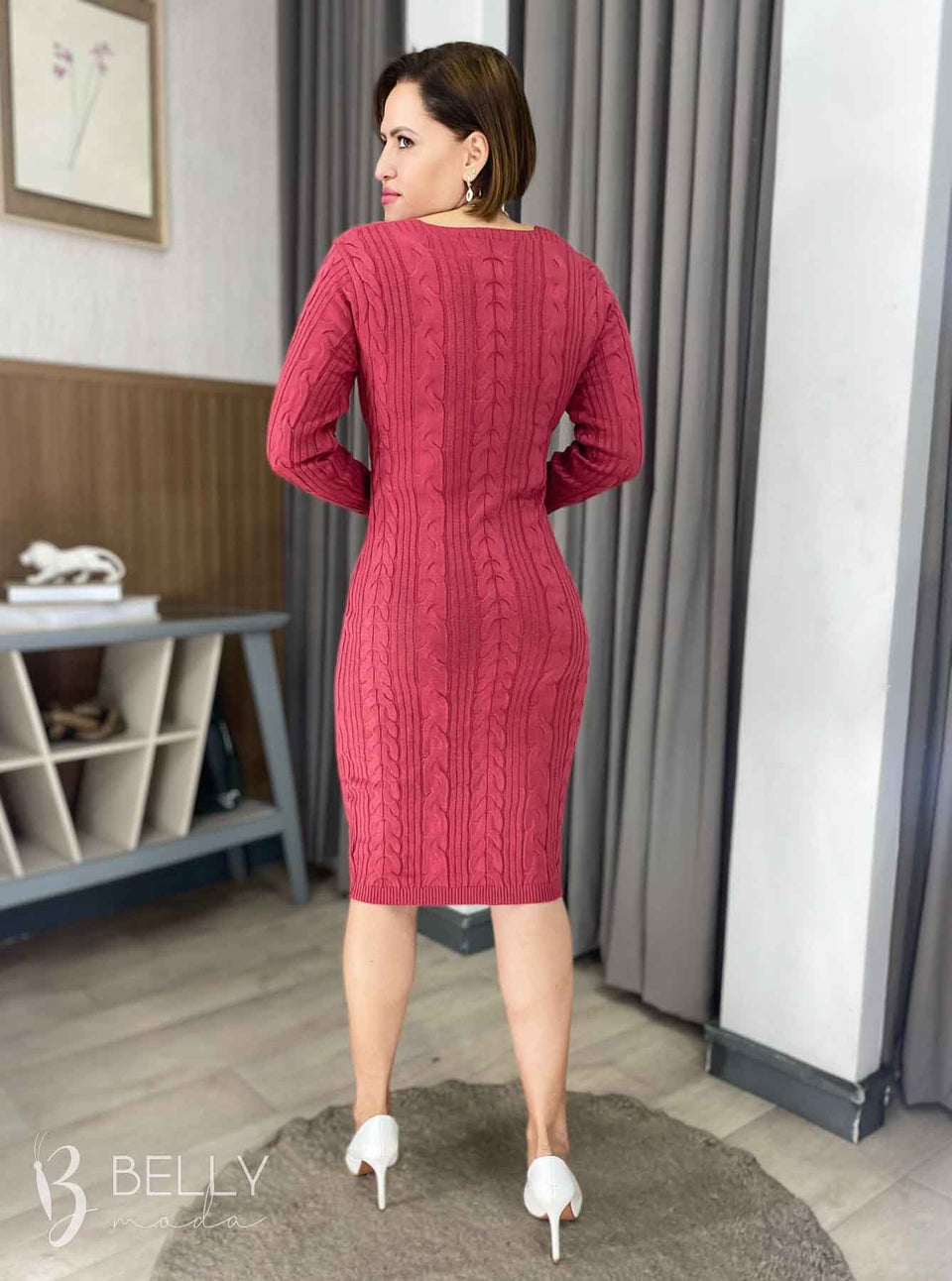 • Mangas longas, decote em "V" e comprimento na altura do joelho