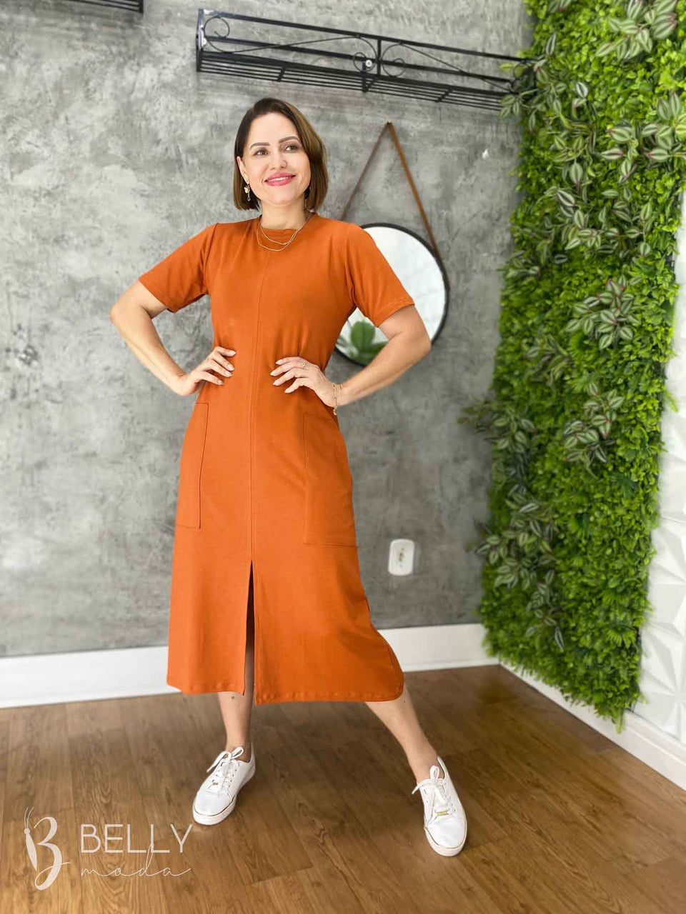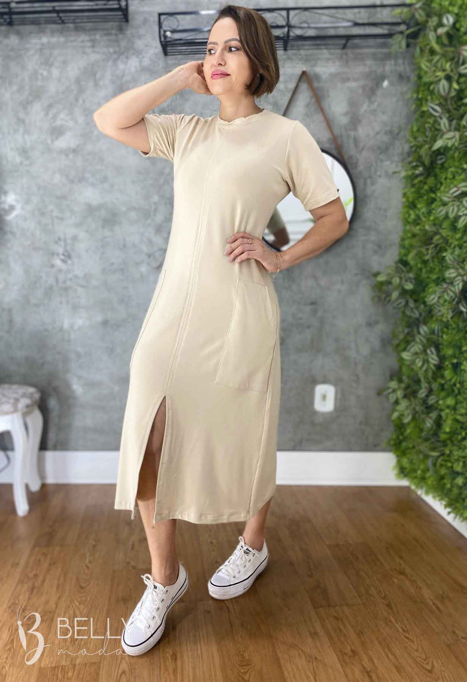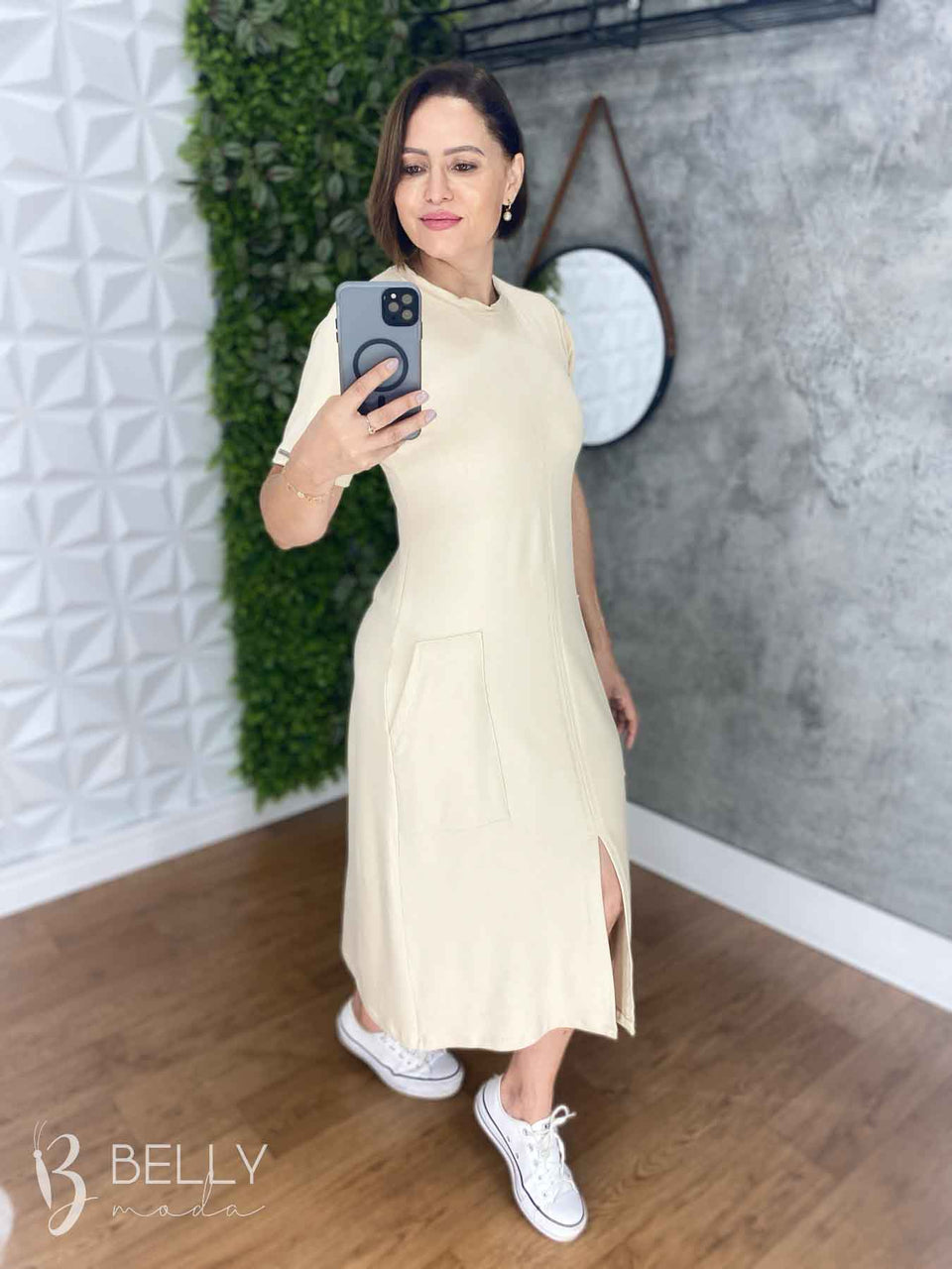 Vestido Joyce Midi - Belly Moda é confeccionado em moletinho, com modelagem mais soltinha e manga curta. Possui um recorte frontal finalizado com uma fenda, bolso frontal funcional e comprimento midi abaixo do joelho. Ideal para um look casual e confortável, garantindo estilo e praticidade.