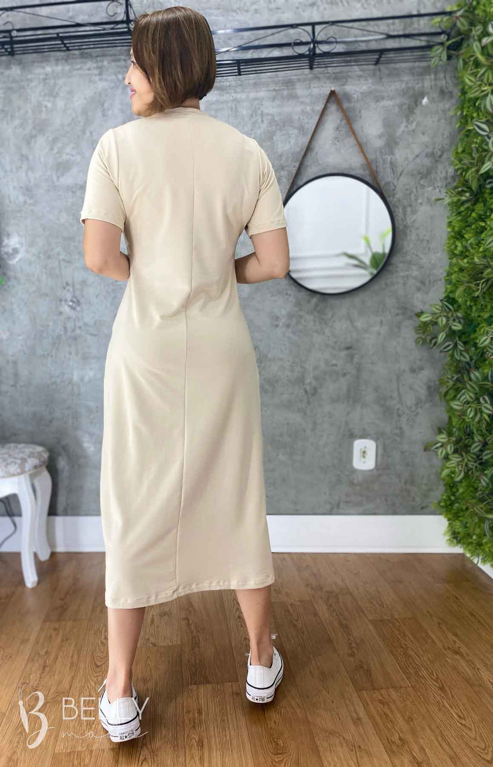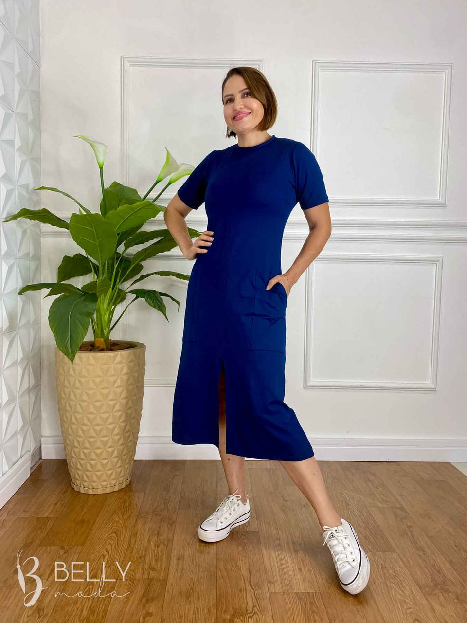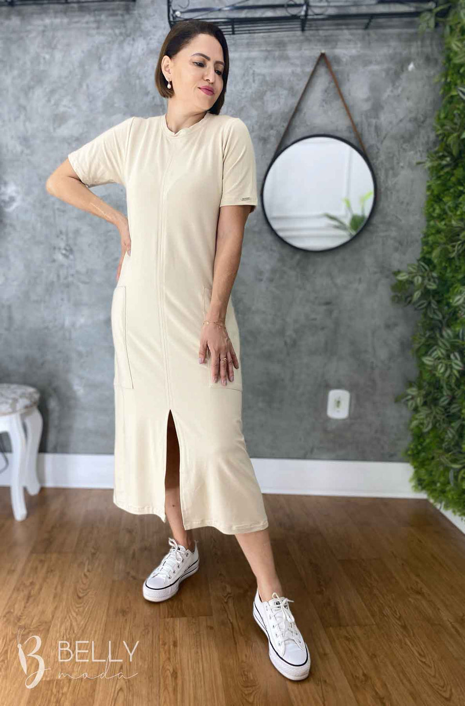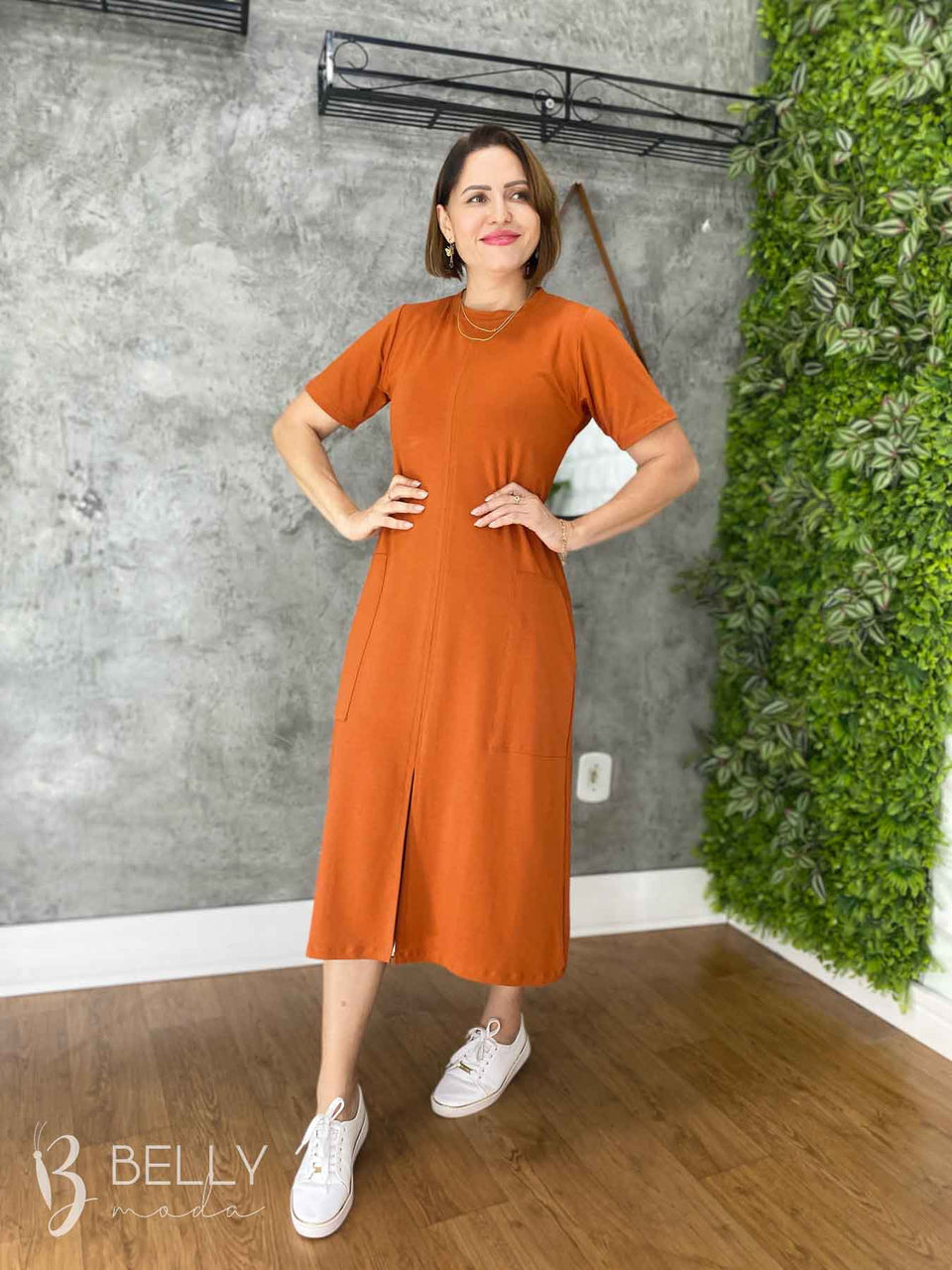 Vestido Joyce Midi - Belly Moda é confeccionado em moletinho, com modelagem mais soltinha e manga curta. Possui um recorte frontal finalizado com uma fenda, bolso frontal funcional e comprimento midi abaixo do joelho. Ideal para um look casual e confortável, garantindo estilo e praticidade.