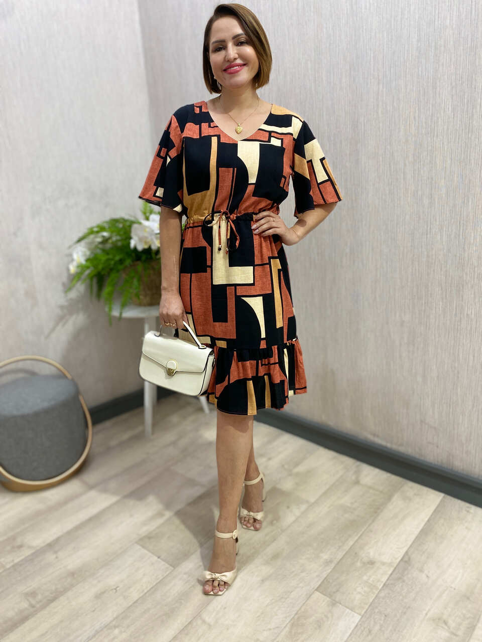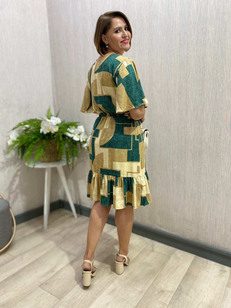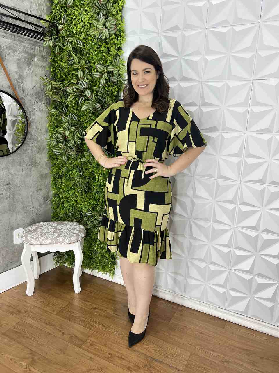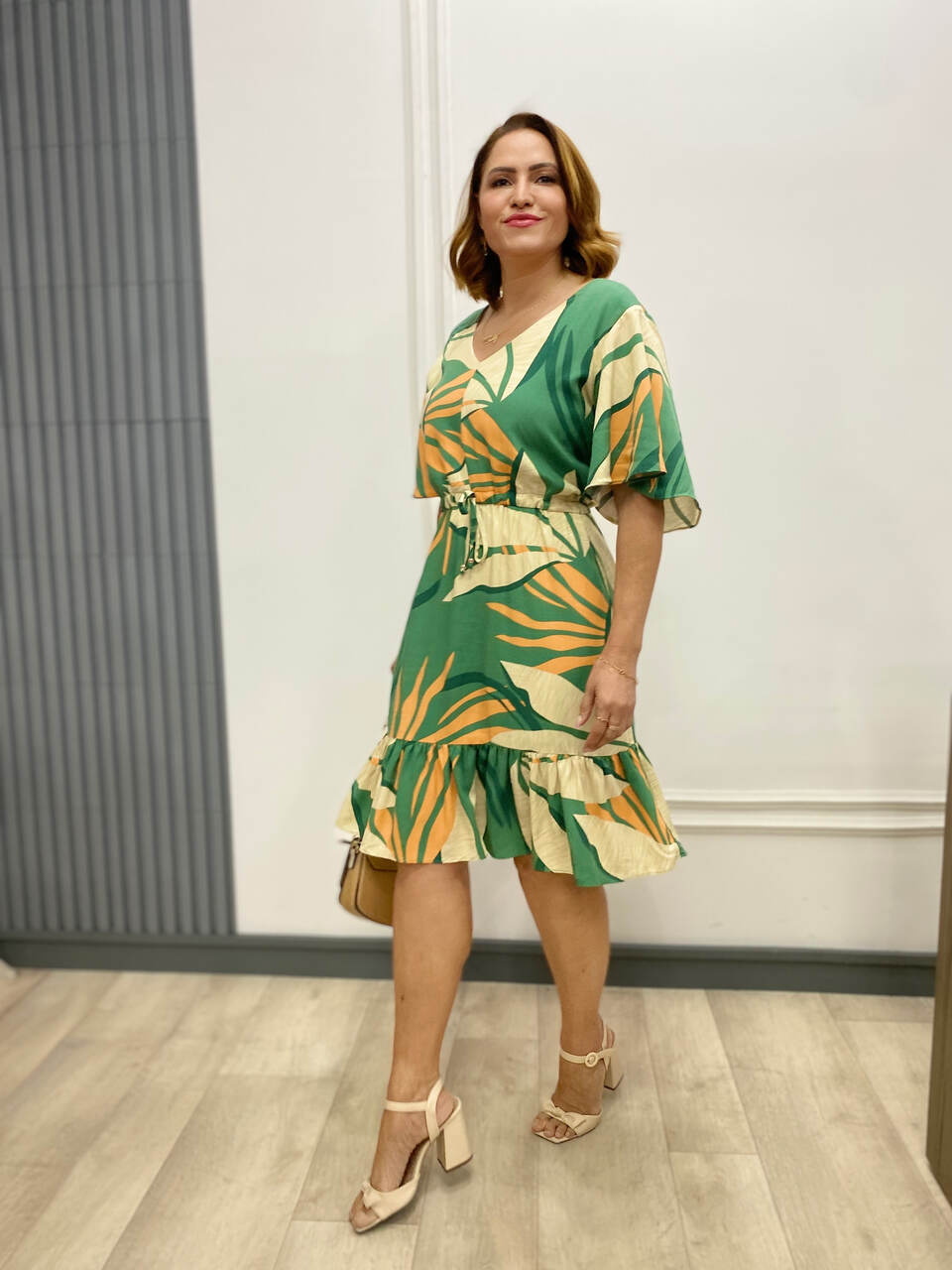 Vestido Lia com babado, da Belly Moda, é confeccionado em viscolinho. Possui modelagem evasê com tunel de regulagem na cintura, decote em "V" e manga curta ampla. Sua saia é forrada e finalizada com um babado, conferindo um toque delicado e feminino à peça. Ideal para compor looks charmosos e versáteis.