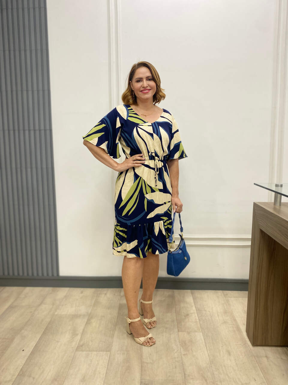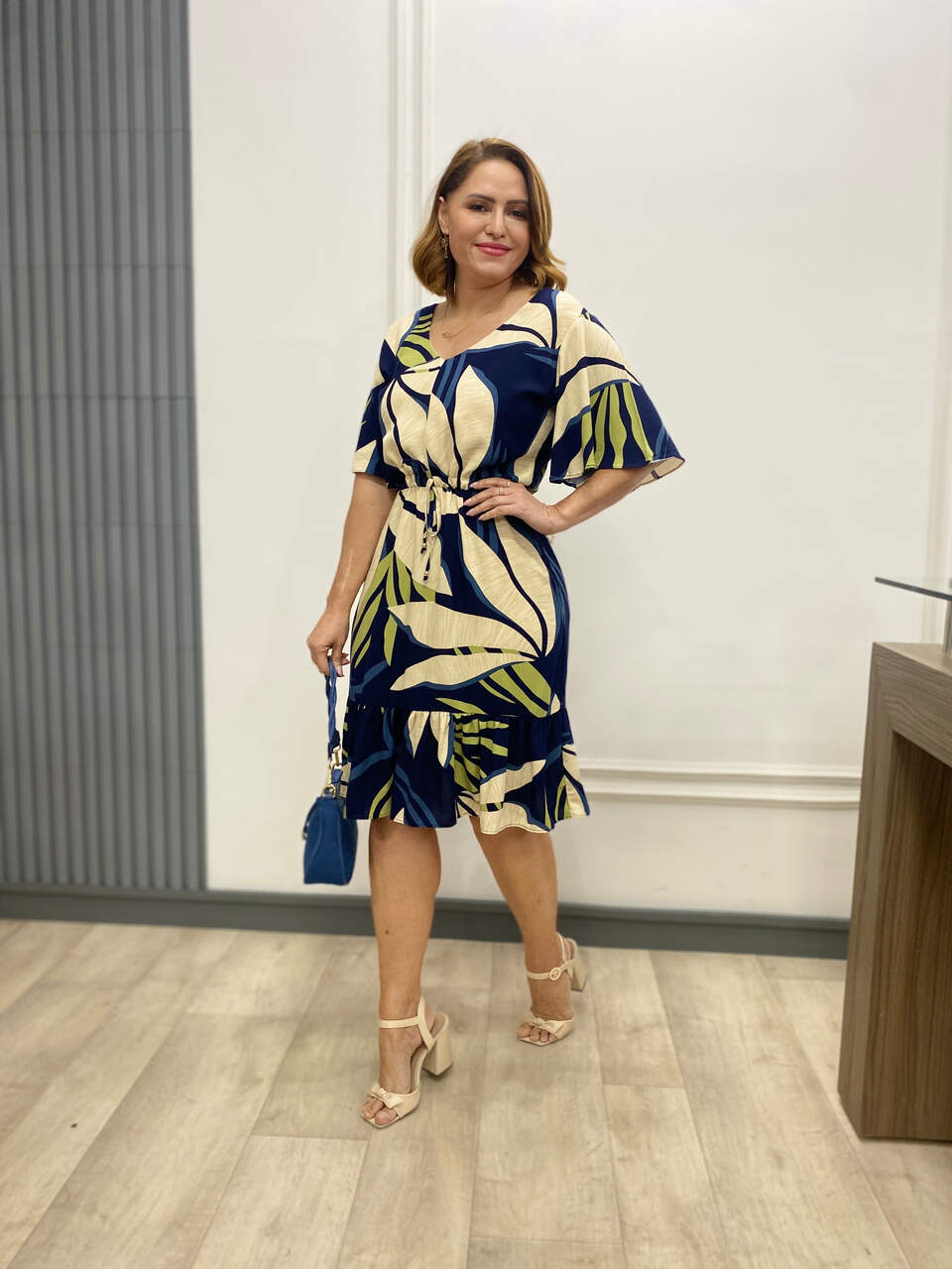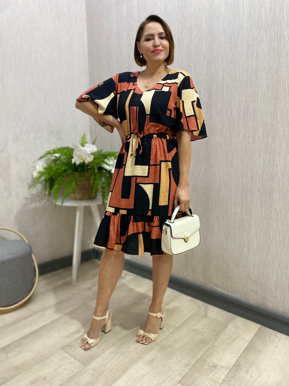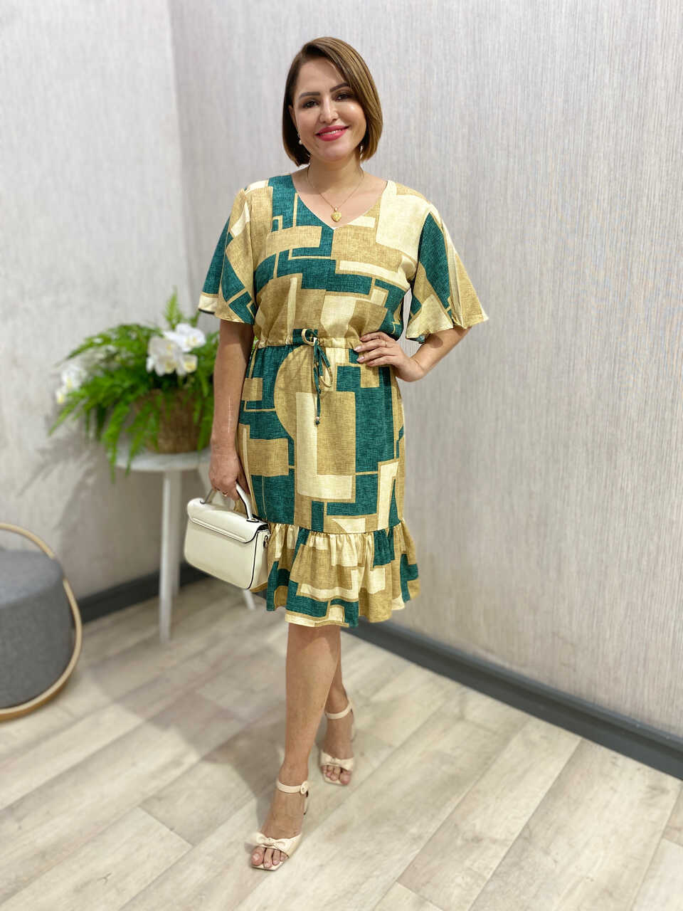 Vestido Lia com babado, da Belly Moda, é confeccionado em viscolinho. Possui modelagem evasê com tunel de regulagem na cintura, decote em "V" e manga curta ampla. Sua saia é forrada e finalizada com um babado, conferindo um toque delicado e feminino à peça. Ideal para compor looks charmosos e versáteis.