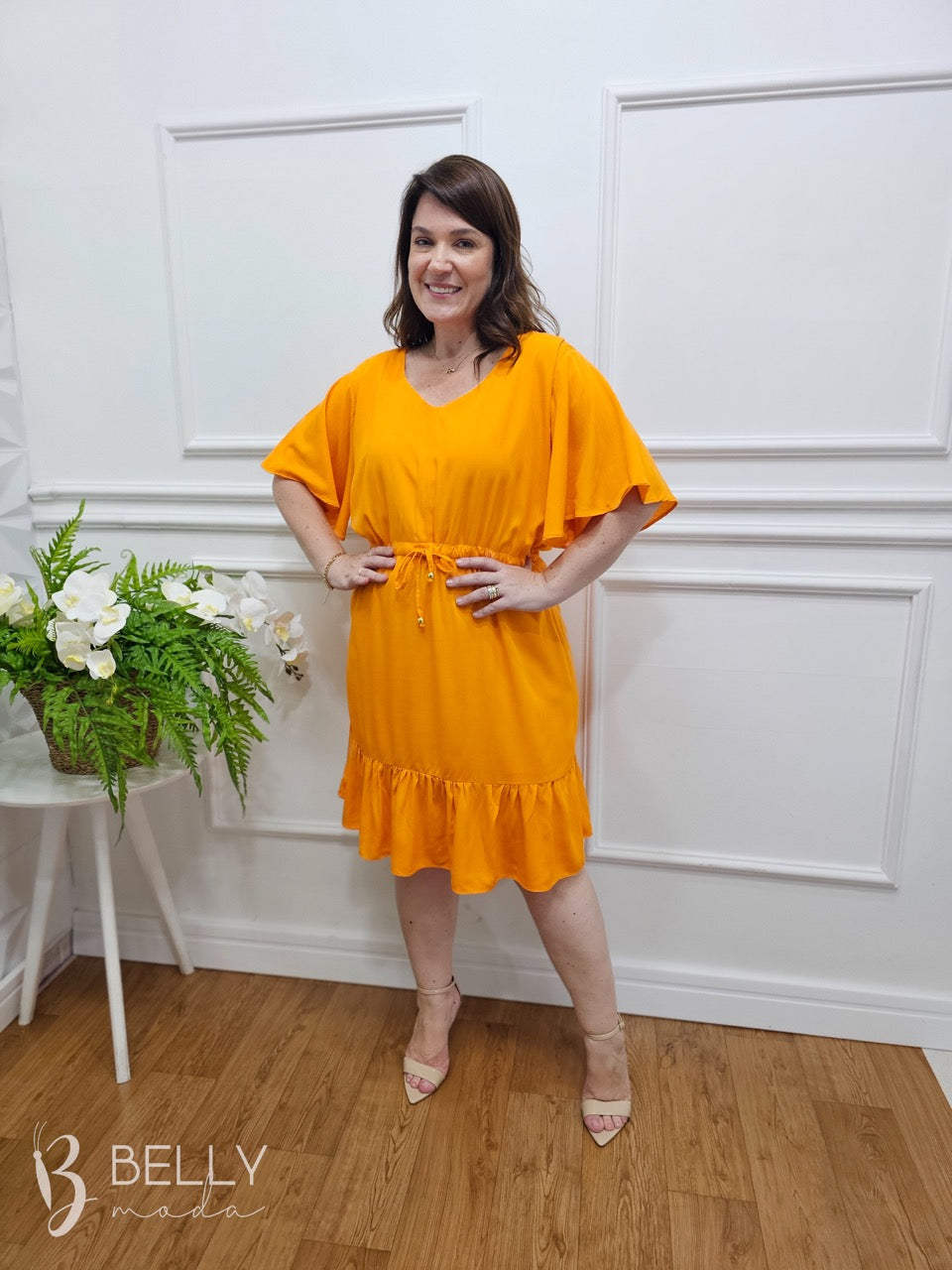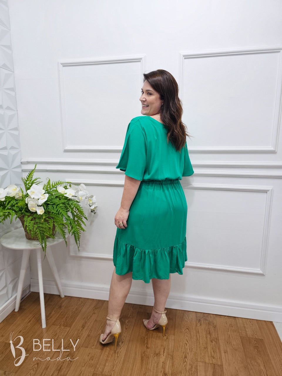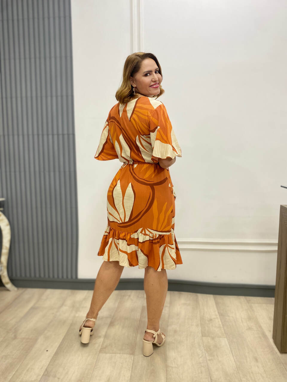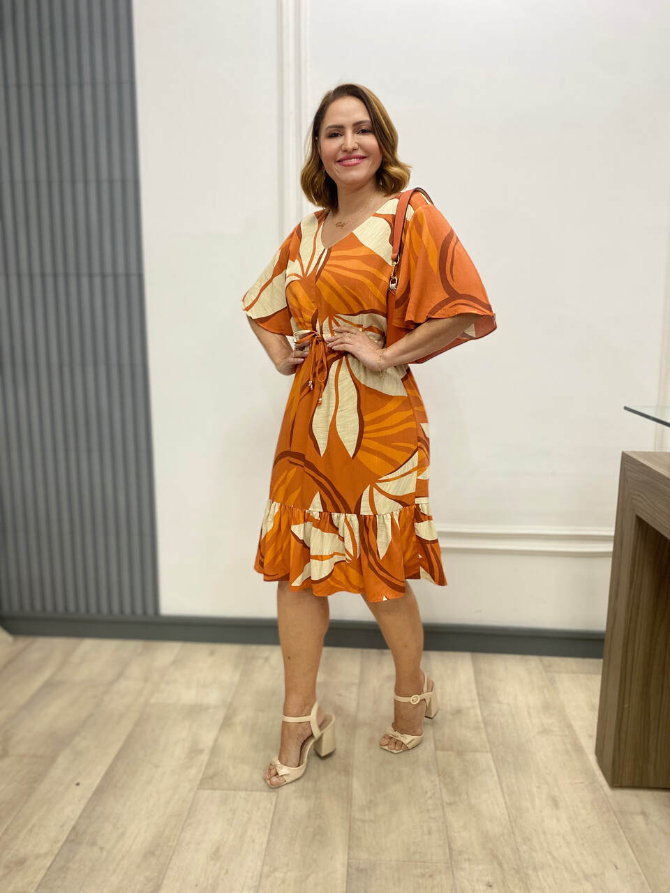 Vestido Lia com babado, da Belly Moda, é confeccionado em viscolinho. Possui modelagem evasê com tunel de regulagem na cintura, decote em "V" e manga curta ampla. Sua saia é forrada e finalizada com um babado, conferindo um toque delicado e feminino à peça. Ideal para compor looks charmosos e versáteis.