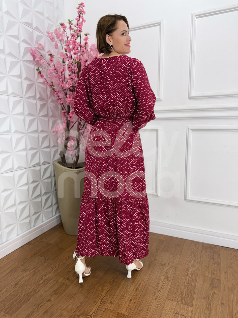 Vestido Liriel Max Midi da Belly Moda, com modelagem evasê soltinha e caimento impecável. Confeccionado em viscolinho, possui meia manga raglã ampla, lastex na cintura, decote em "V" e barrado assimétrico com abertura lateral. Seu comprimento max midi traz elegância e versatilidade ao look. Destaque para as estampas exclusivas que garantem um visual único e cheio de estilo.
