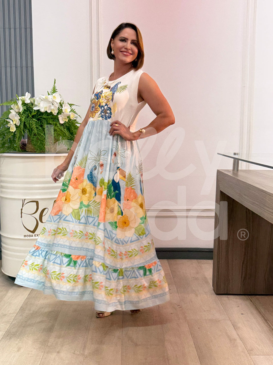 Vestido Longo Amar Tropical em Viscolinho e Malha Casual Elegante