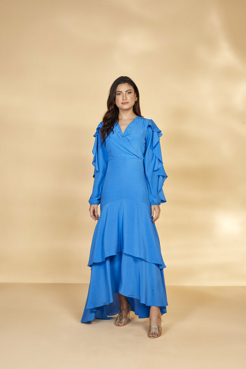 Vestido longo de manga longa com babados, perfeito para quem busca elegância e conforto. Possui um caimento fluido, modelagem acinturada e estampa delicada, que garantem um visual romântico e sofisticado. Versátil, pode ser usado em diversas ocasiões, desde um passeio no parque até um jantar especial.