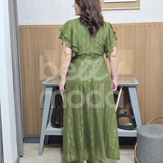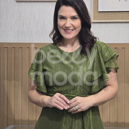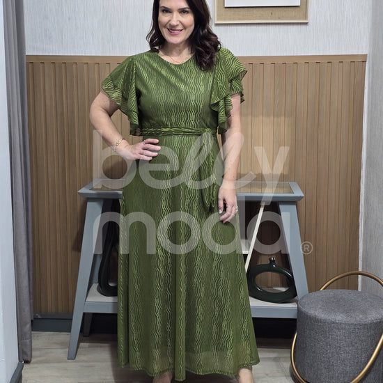 O Vestido Rayssa é confeccionado em tule texturizado, trazendo leveza e fluidez à peça. Sua modelagem é mais solta, proporcionando conforto, e acompanha uma faixa para marcar a cintura conforme o desejo. As mangas com babados duplos garantem um toque romântico e elegante, ideal para ocasiões especiais.
