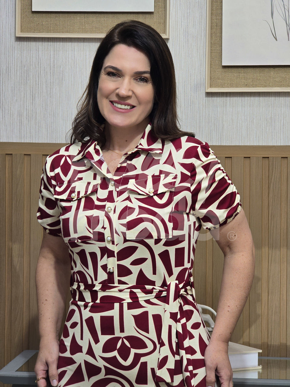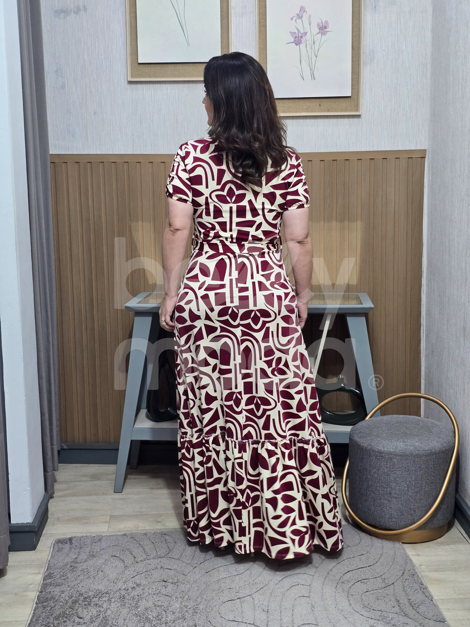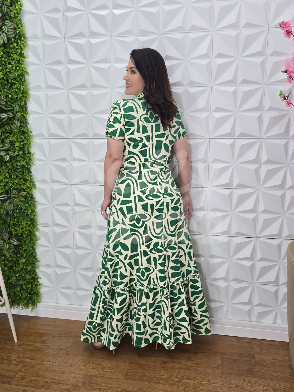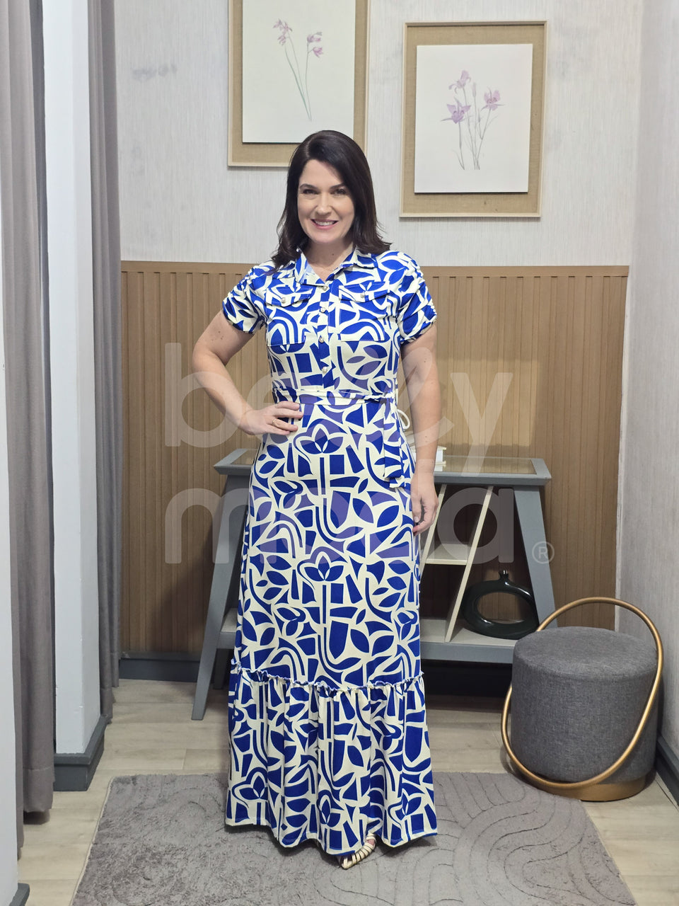 O Vestido Longo Sofia é confeccionado em viscose leve e fluida, proporcionando conforto e sofisticação ao look. O modelo traz gola de camisa com botões decorativos no busto, bolsos funcionais e uma maria na saia que garante movimento. Com manga curta franzida, passantes e faixa para amarração na cintura, valoriza a silhueta de forma delicada e elegante.