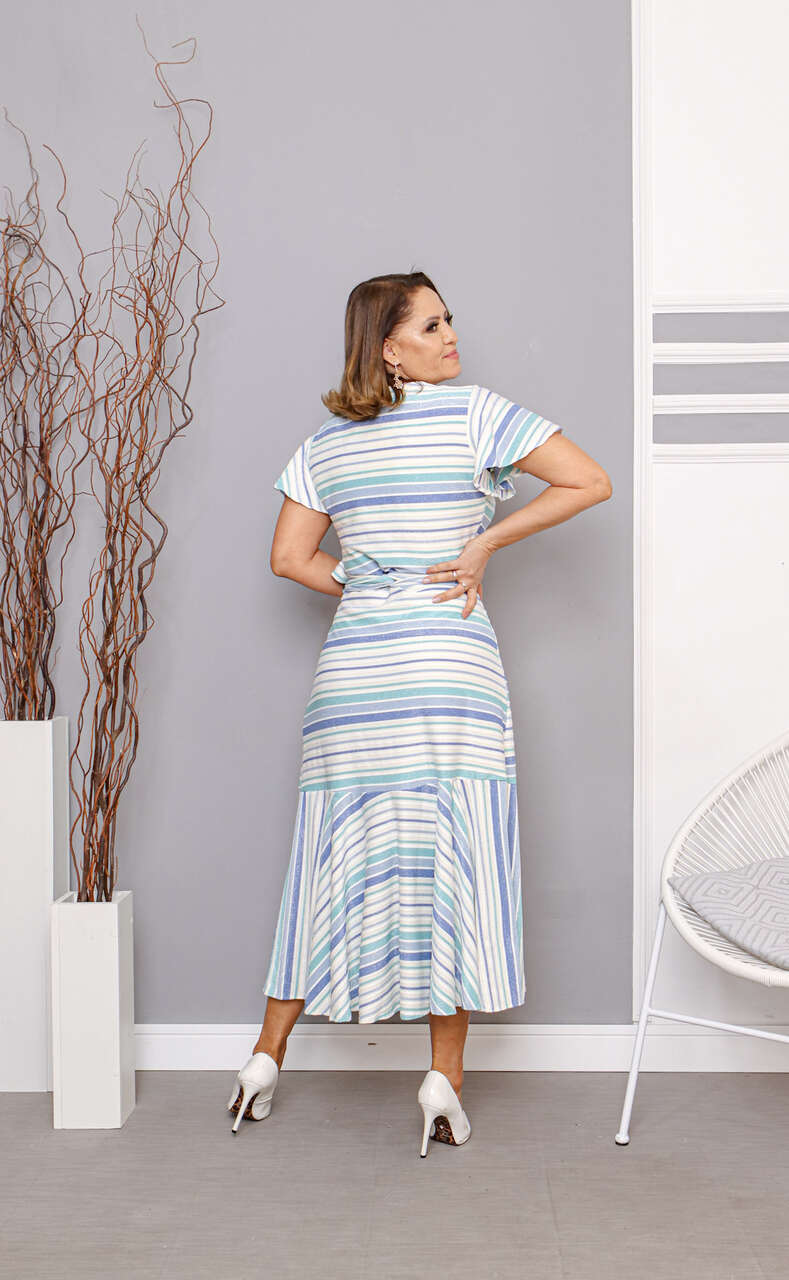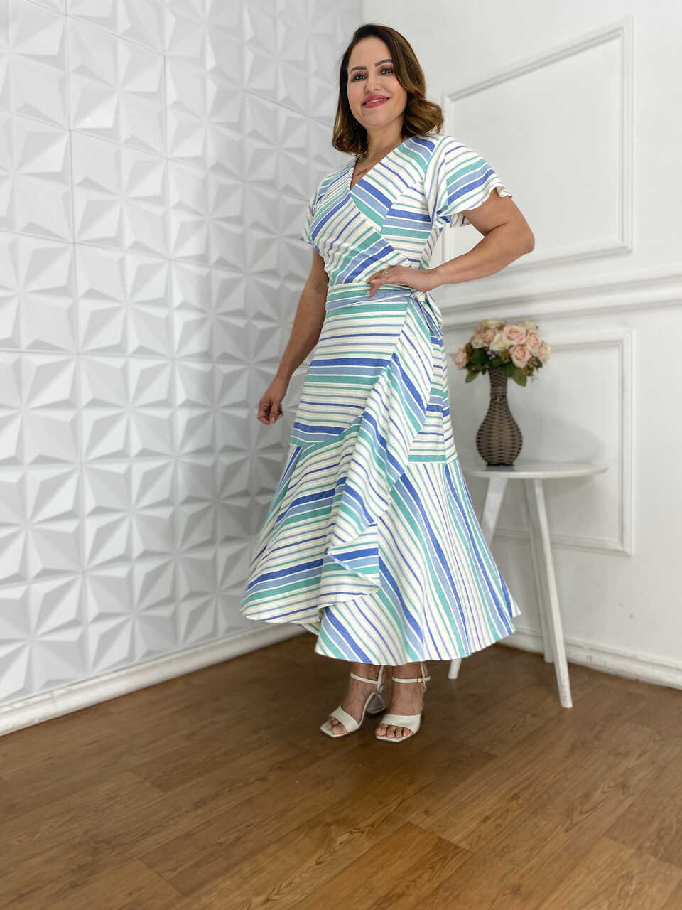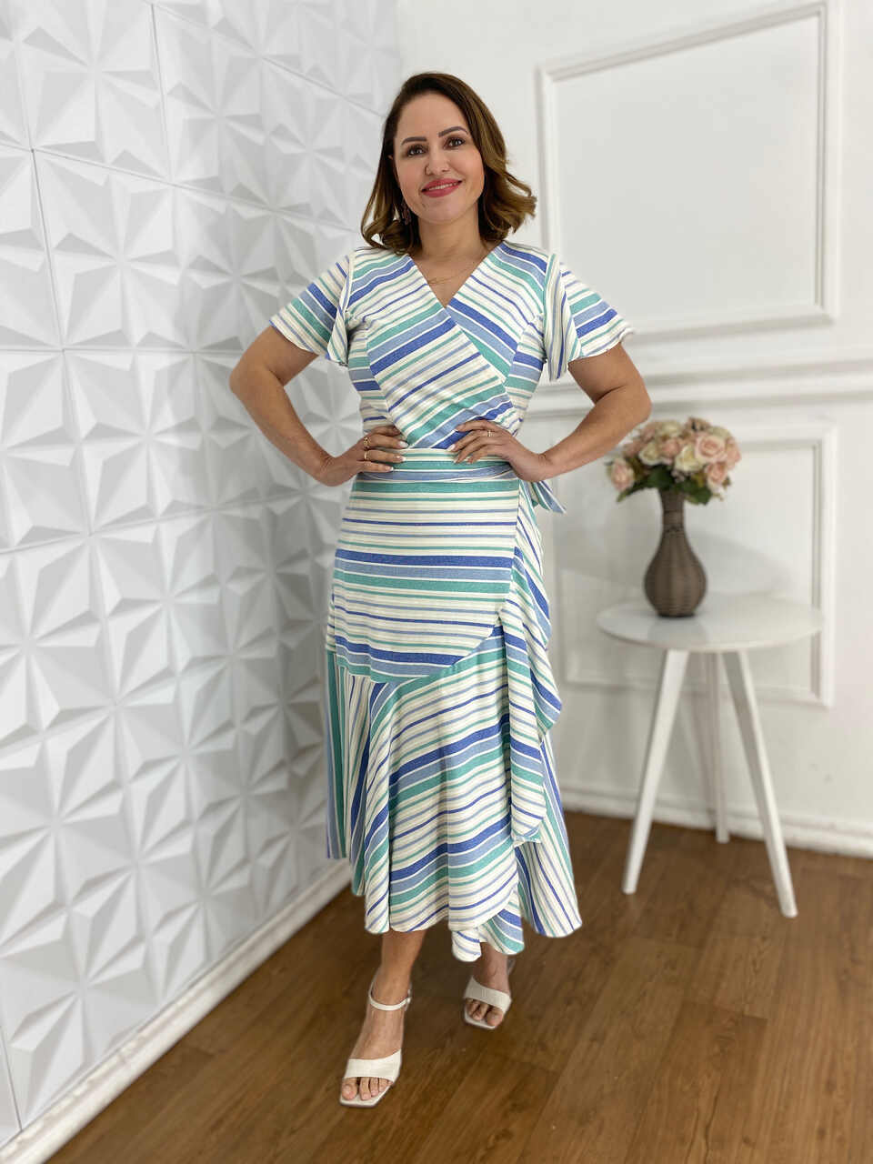 Vestido envelope listrado em lurex, confeccionado em tecido de alta costura e alfaiataria. Possui modelagem sino e é forrado, garantindo conforto. As mangas curtas amplas adicionam charme ao visual, enquanto o babado na cintura proporciona um toque especial ao look.