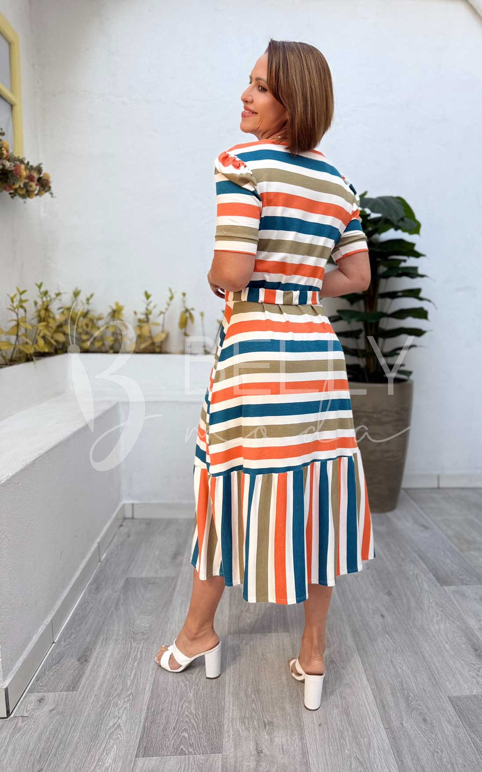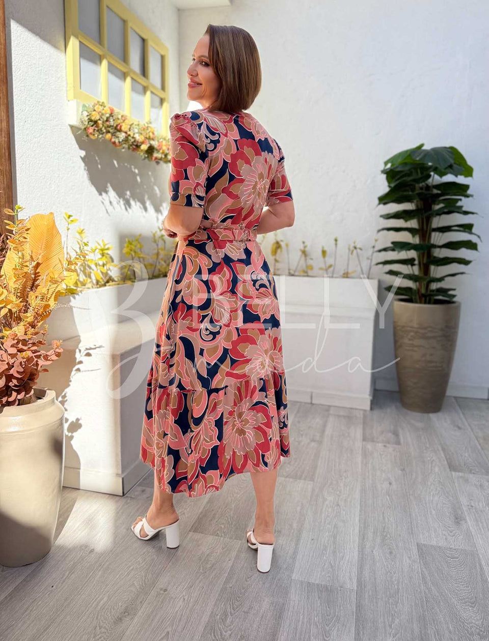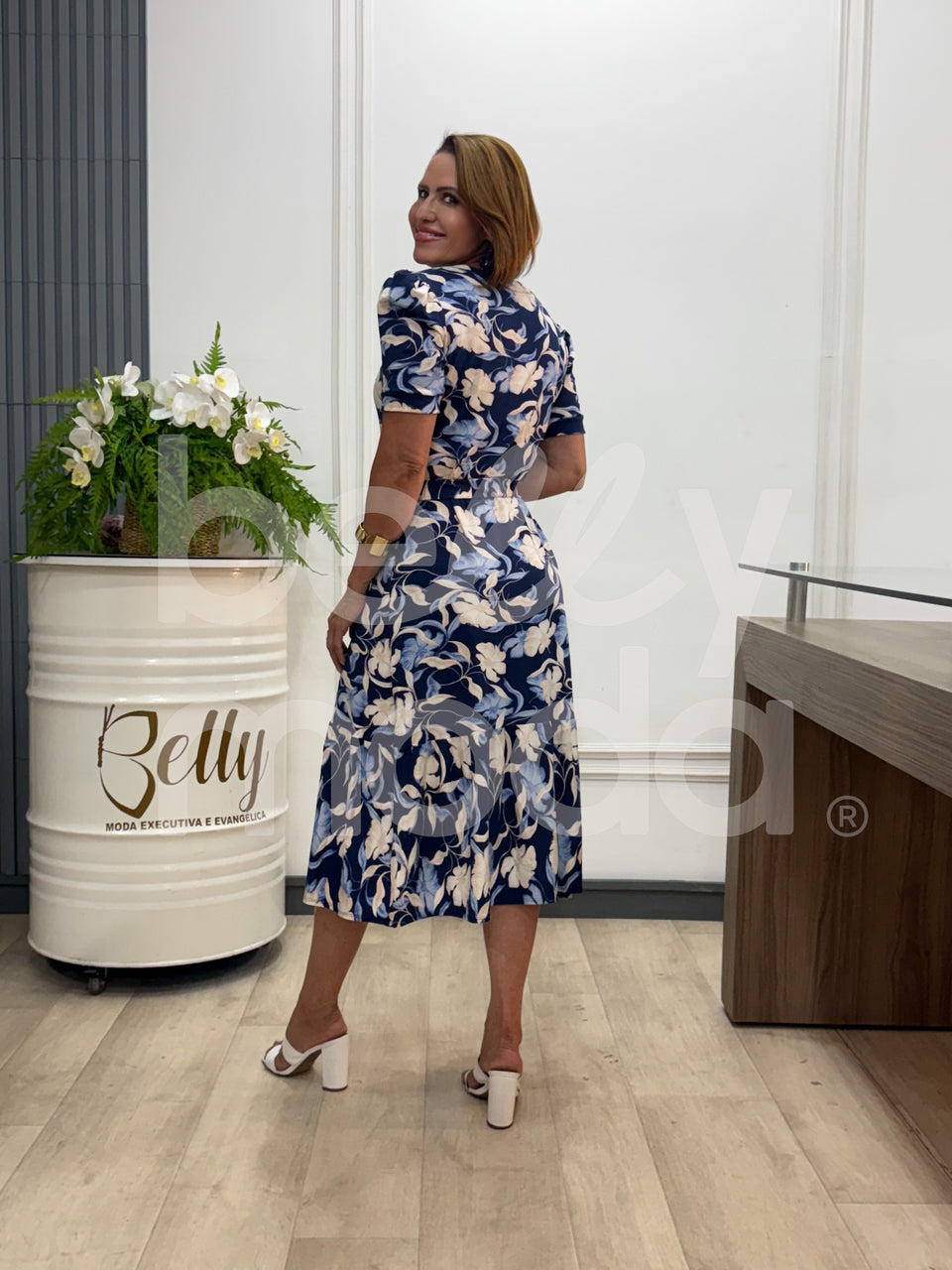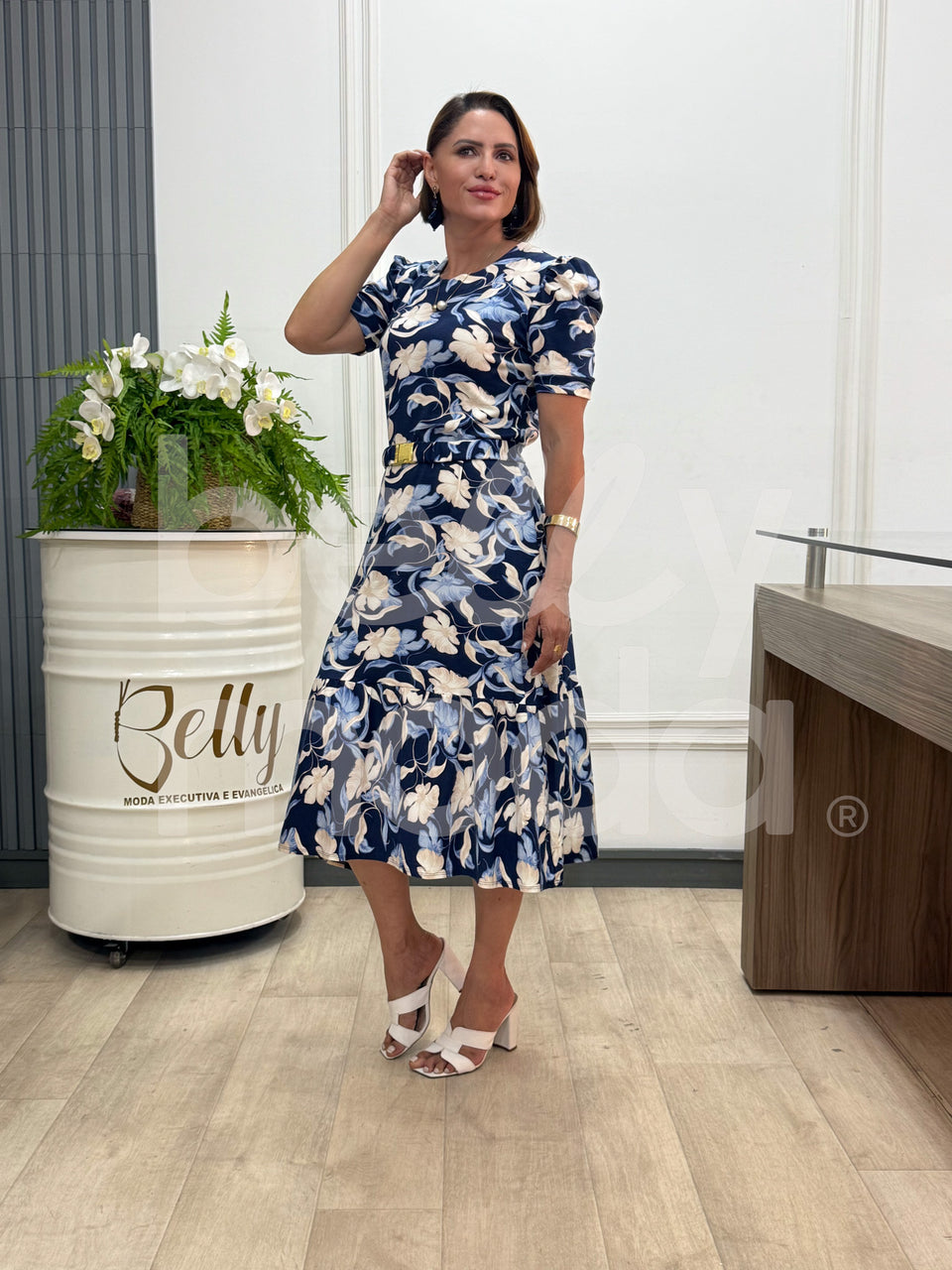 Vestido Magali Midi - Belly Moda - Com modelagem evasê, o vestido Magali é confeccionado em malha viscolycra com toque de algodão, proporcionando conforto e vestibilidade. Seu comprimento midi, com um babado em Maria, e cinto com elástico para marcar a cintura, garantem um visual elegante e feminino.