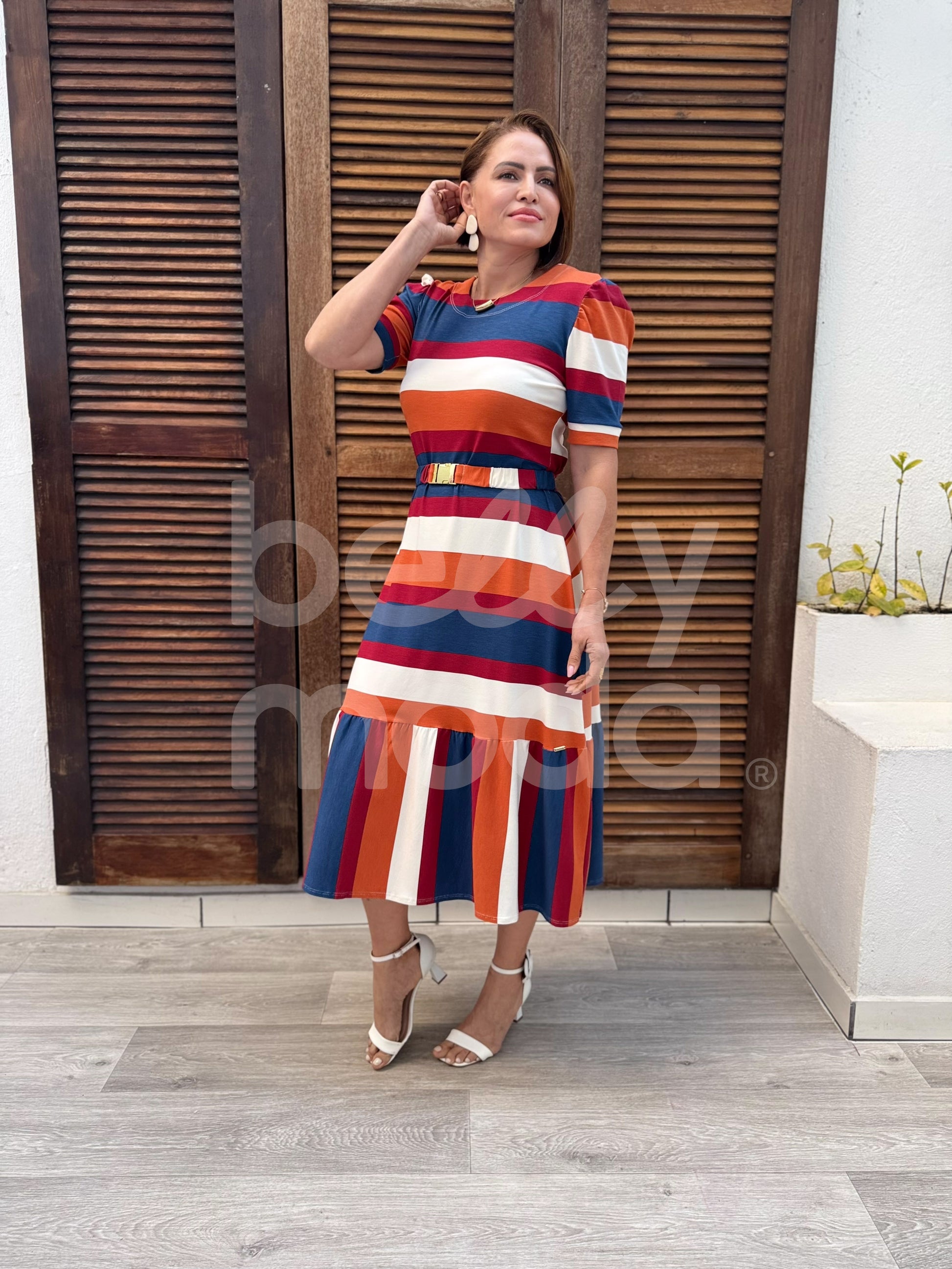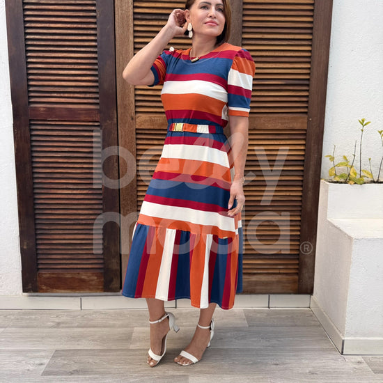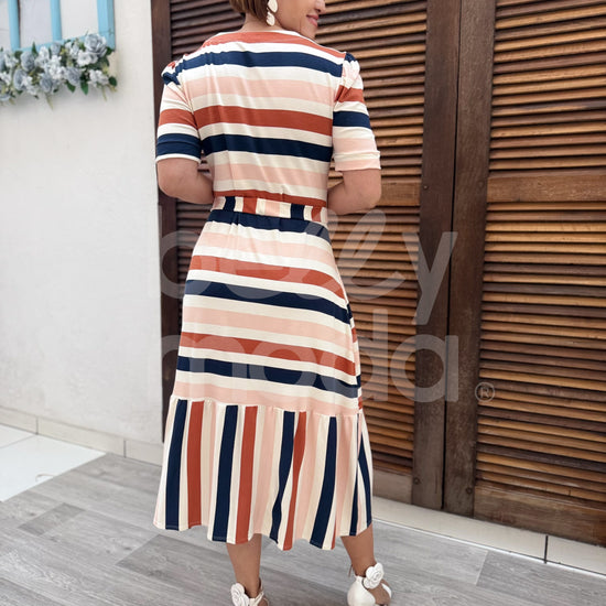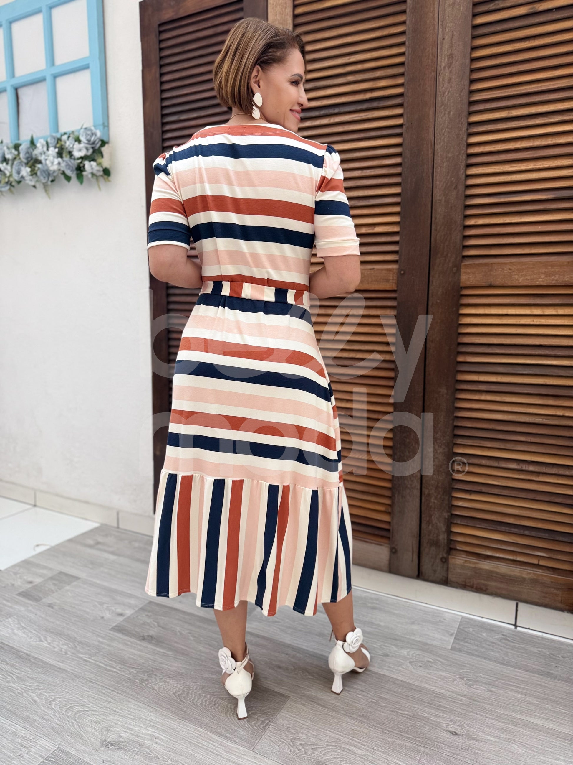 Vestido Magali Midi - Belly Moda - Com modelagem evasê, o vestido Melissa é confeccionado em malha viscolycra com toque de algodão, proporcionando conforto e vestibilidade. Seu comprimento midi, com um babado em Maria, e cinto com elástico para marcar a cintura, garantem um visual elegante e feminino.