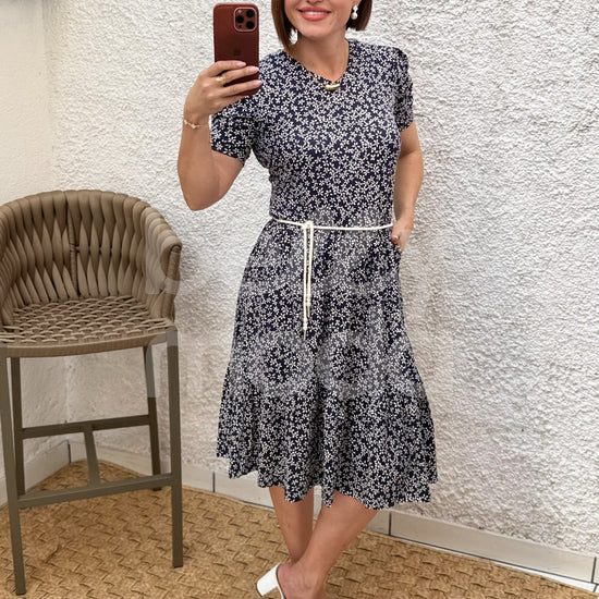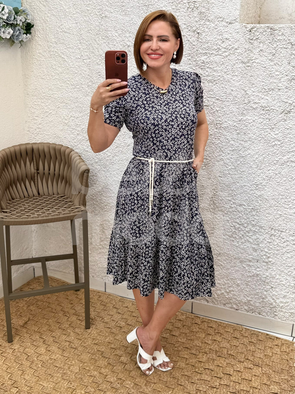 O Vestido Alice é confeccionado em malha viscolycra, garantindo conforto e caimento impecável. Com gola em V acompanhada de colarinho, manga curta levemente bufante finalizada com punho e elástico na cintura e bolsos, a peça valoriza a silhueta com feminilidade. O cordão decorativo com ponteiras de pérola e a saia com maria trazem charme e delicadeza ao modelo midi, ideal para diversas ocasiões.