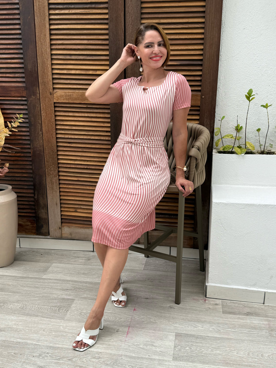 Combine o Vestido Miranda Midi com sandálias neutras ou salto bloco para um look moderno, leve e elegante.