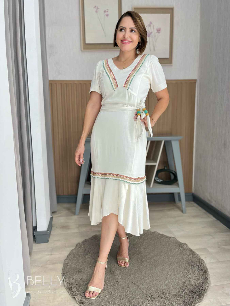 Vestido midi confeccionado em tecido plano de viscose sarjada com leve brilho, proporcionando um toque macio e suave. Possui modelagem sino, recortes inteligentes que valorizam a silhueta, faixa para marcar a cintura e detalhes em aviamento bordado. Com forro e fechamento em zíper traseiro, o vestido apresenta decote em "V" alongado, manga curta com franzido sutil e comprimento abaixo do joelho com babado transpassado, garantindo um visual elegante e feminino.