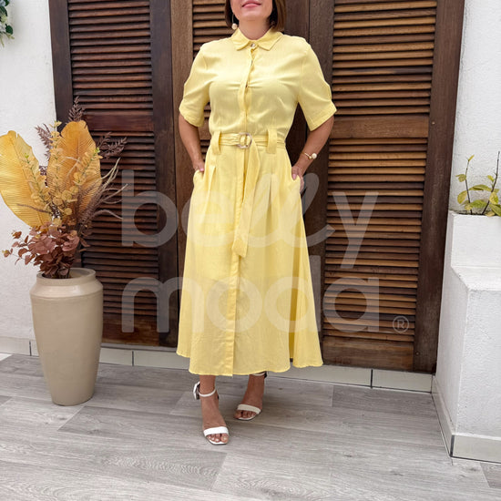 Vestido Samia Max Midi da Belly Moda é uma peça elegante e versátil. Com modelagem evasê e confeccionado em tecido plano de corte alfaiataria, possui manga 3/4 com uma leve prega no punho, comprimento max midi, bolso faca, recorte na cintura com pregas frontais passantes, cinto faixa com aviamento em argola. Seu fechamento em botões frontal com vista e gola de camisa trazem um toque sofisticado ao look.