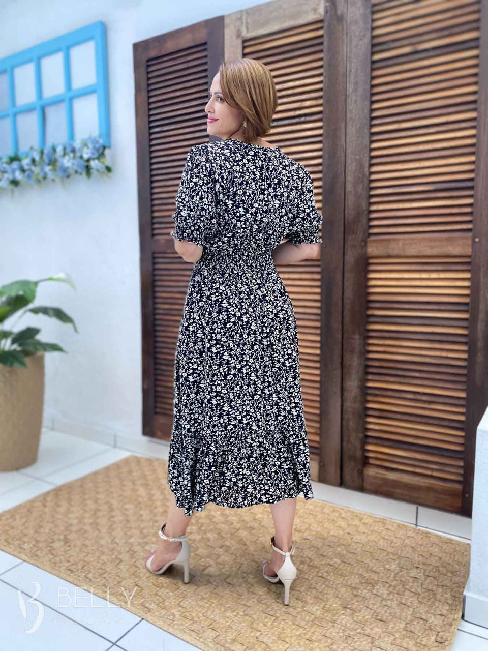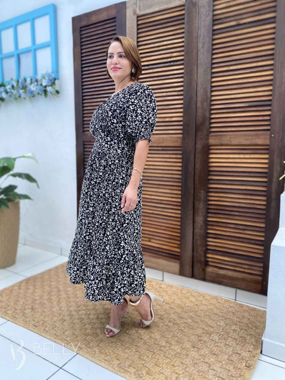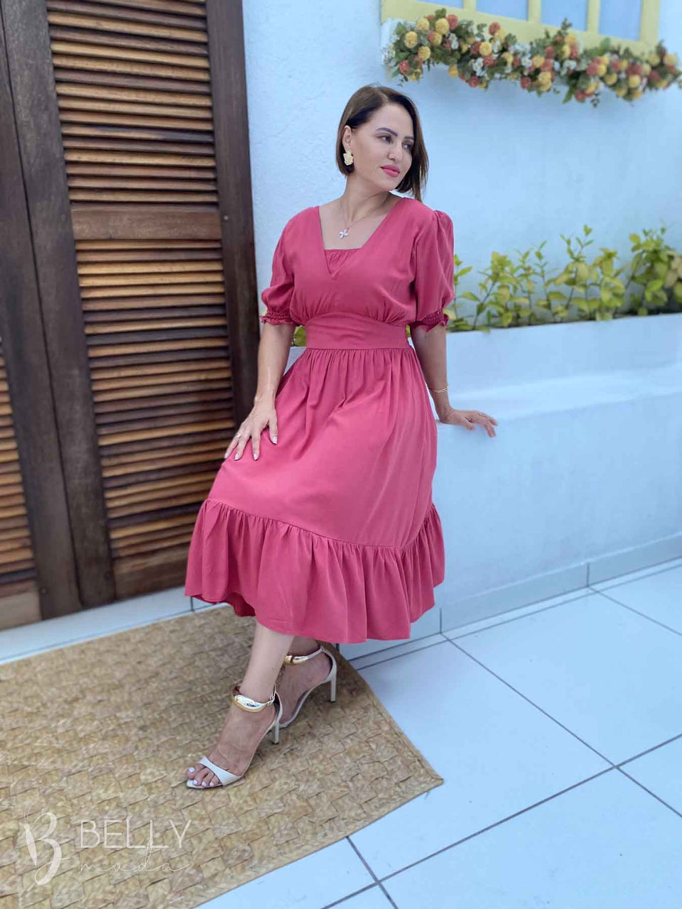 Vestido Silmara Midi com Decote Sobreposto da Belly Moda é uma peça elegante e versátil. Possui modelagem godê que proporciona um caimento fluido, confeccionado em viscolinho, com manga curta finalizada com lastex, decote com sobreposição em V e comprimento midi com um babado. O vestido é forrado da cintura para baixo, garantindo conforto e segurança ao vestir.