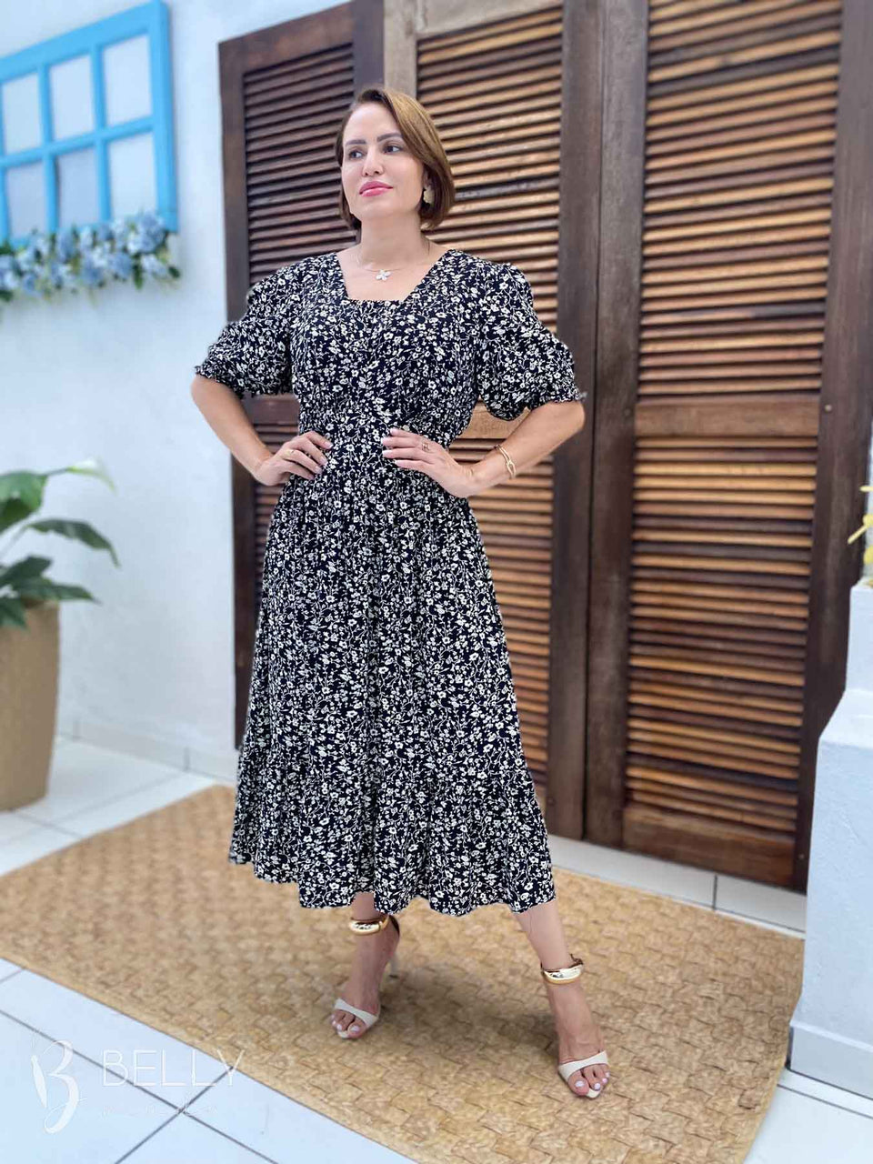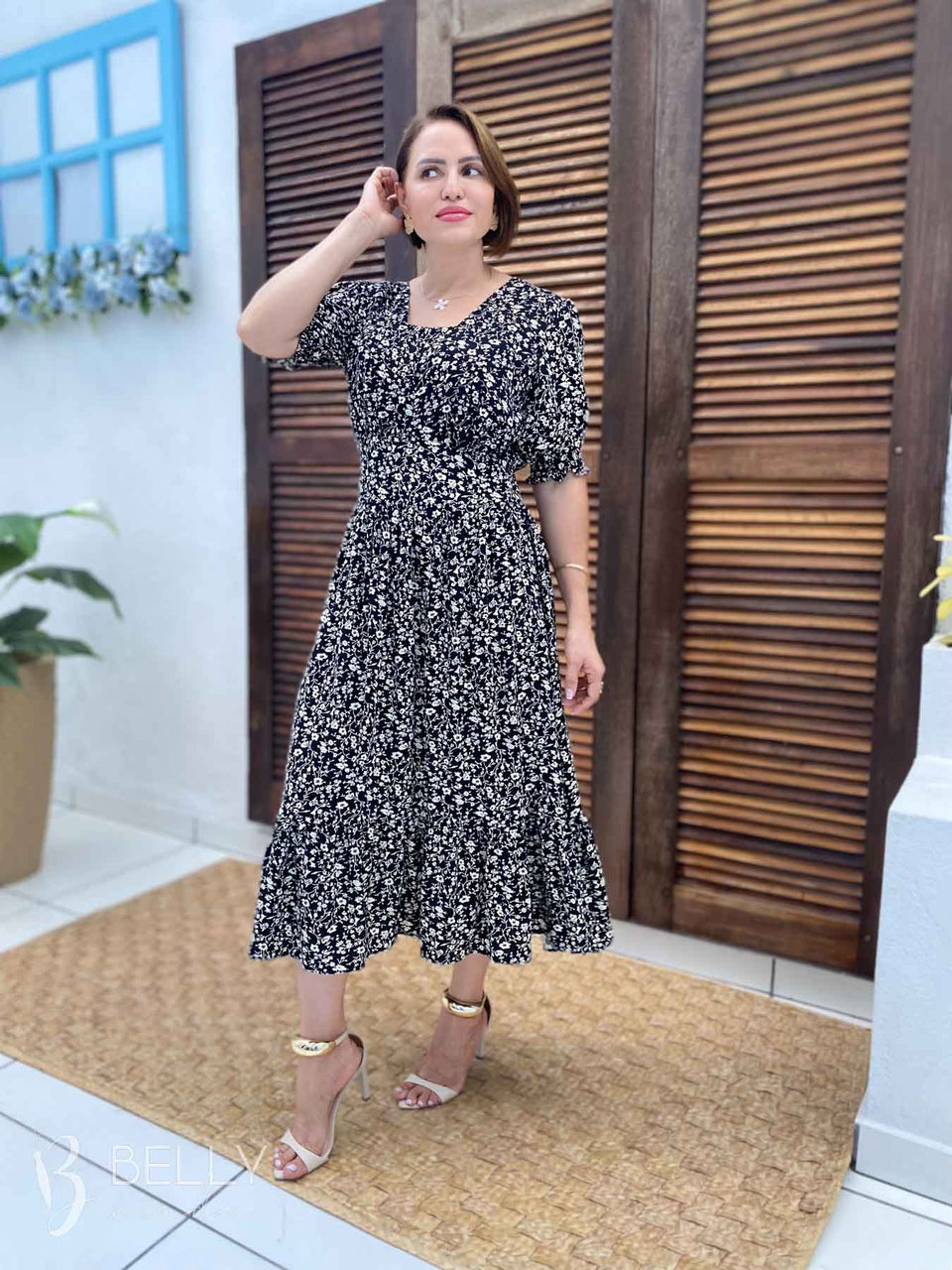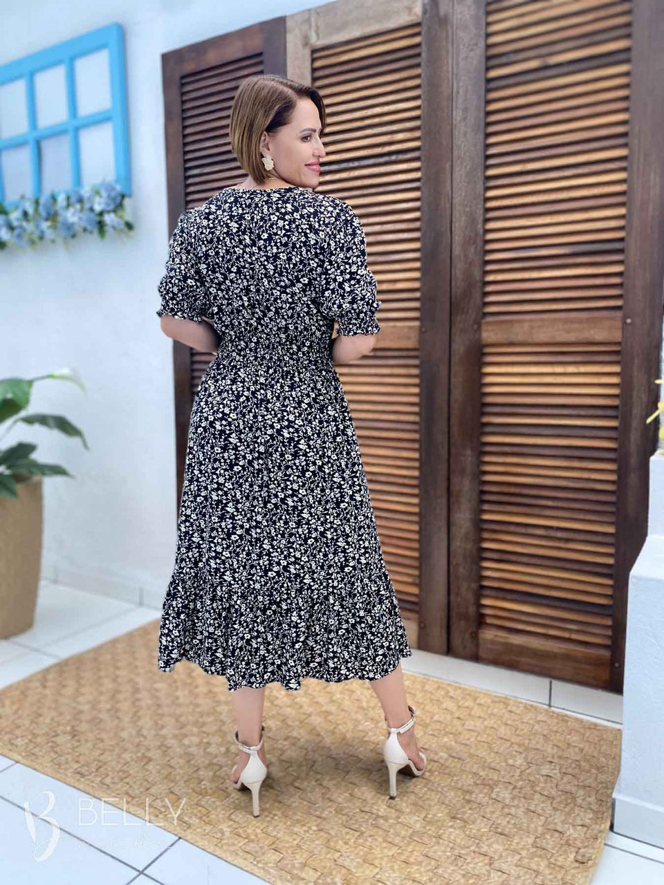 Vestido Silmara Midi com Decote Sobreposto da Belly Moda é uma peça elegante e versátil. Possui modelagem godê que proporciona um caimento fluido, confeccionado em viscolinho, com manga curta finalizada com lastex, decote com sobreposição em V e comprimento midi com um babado. O vestido é forrado da cintura para baixo, garantindo conforto e segurança ao vestir.