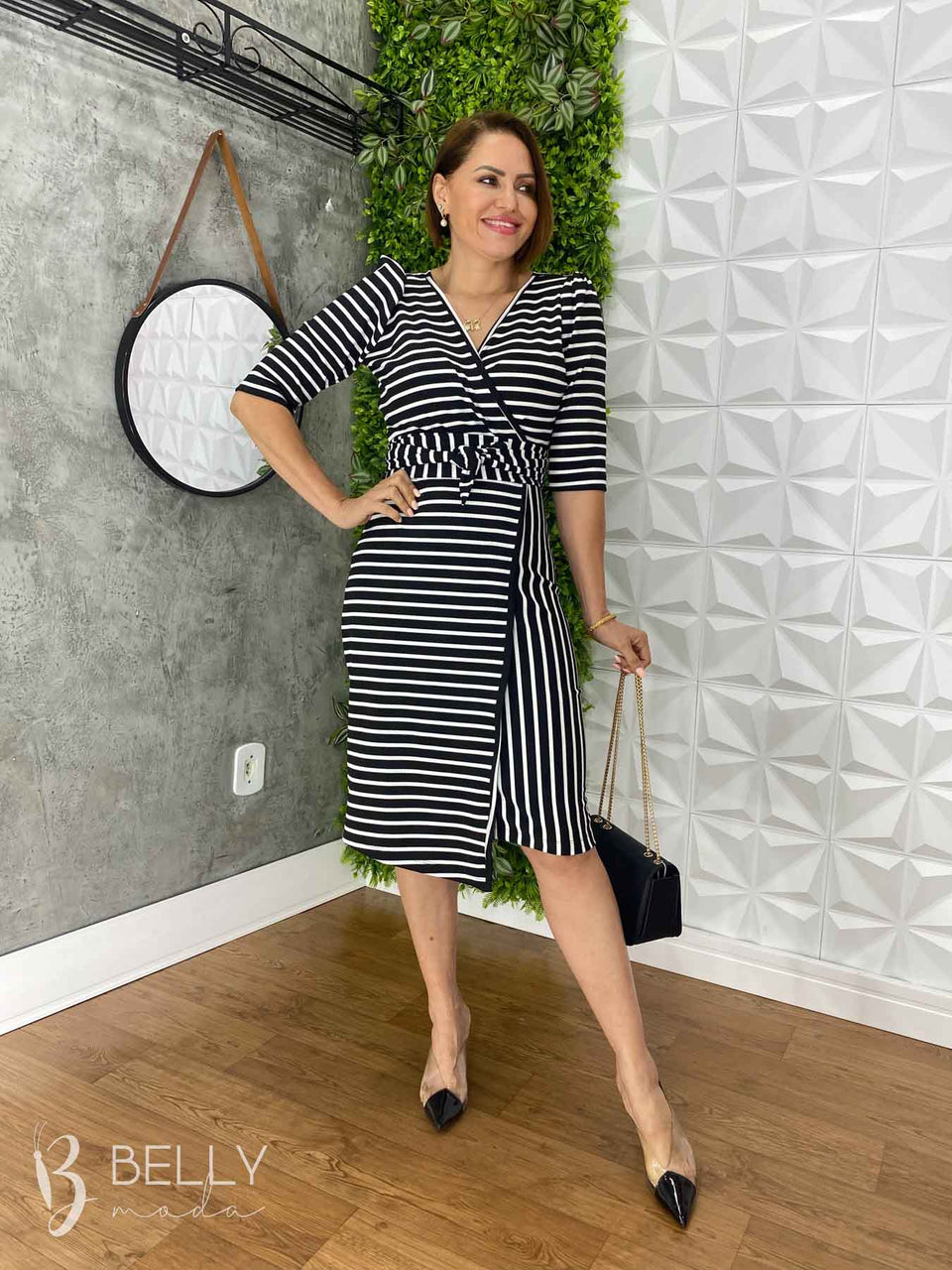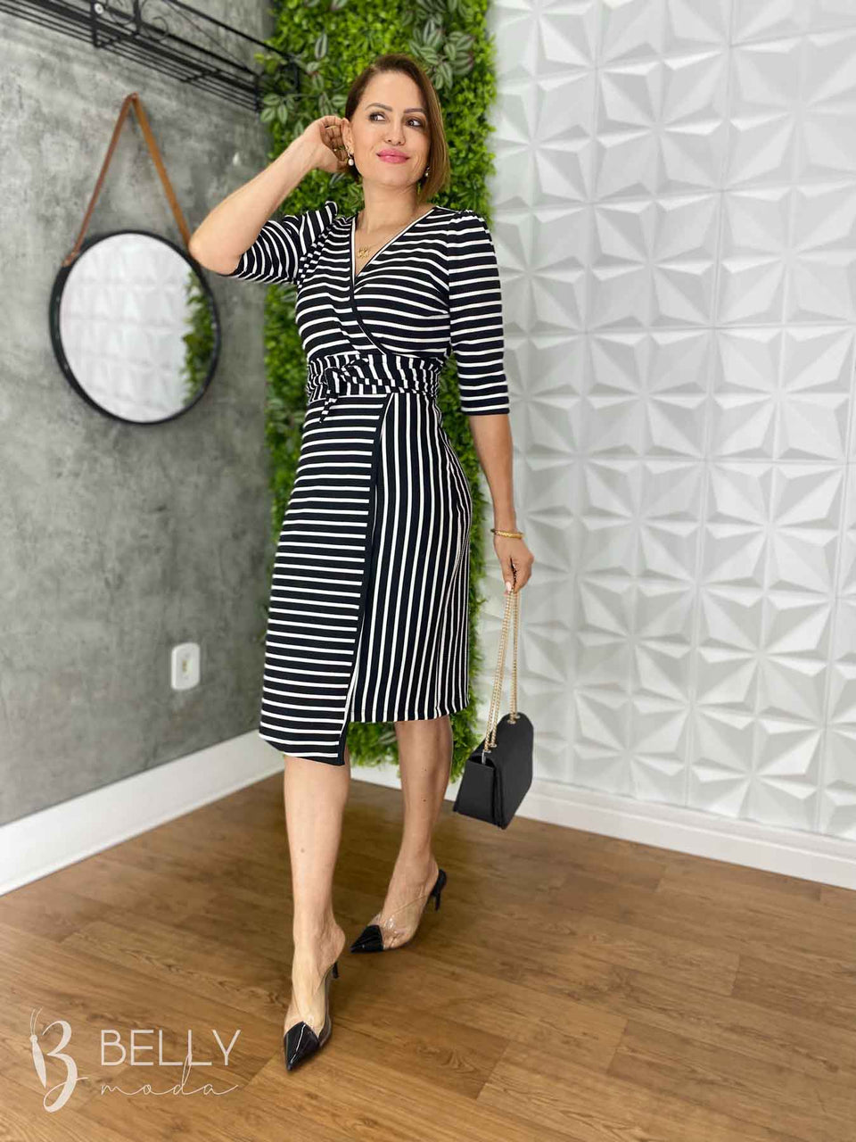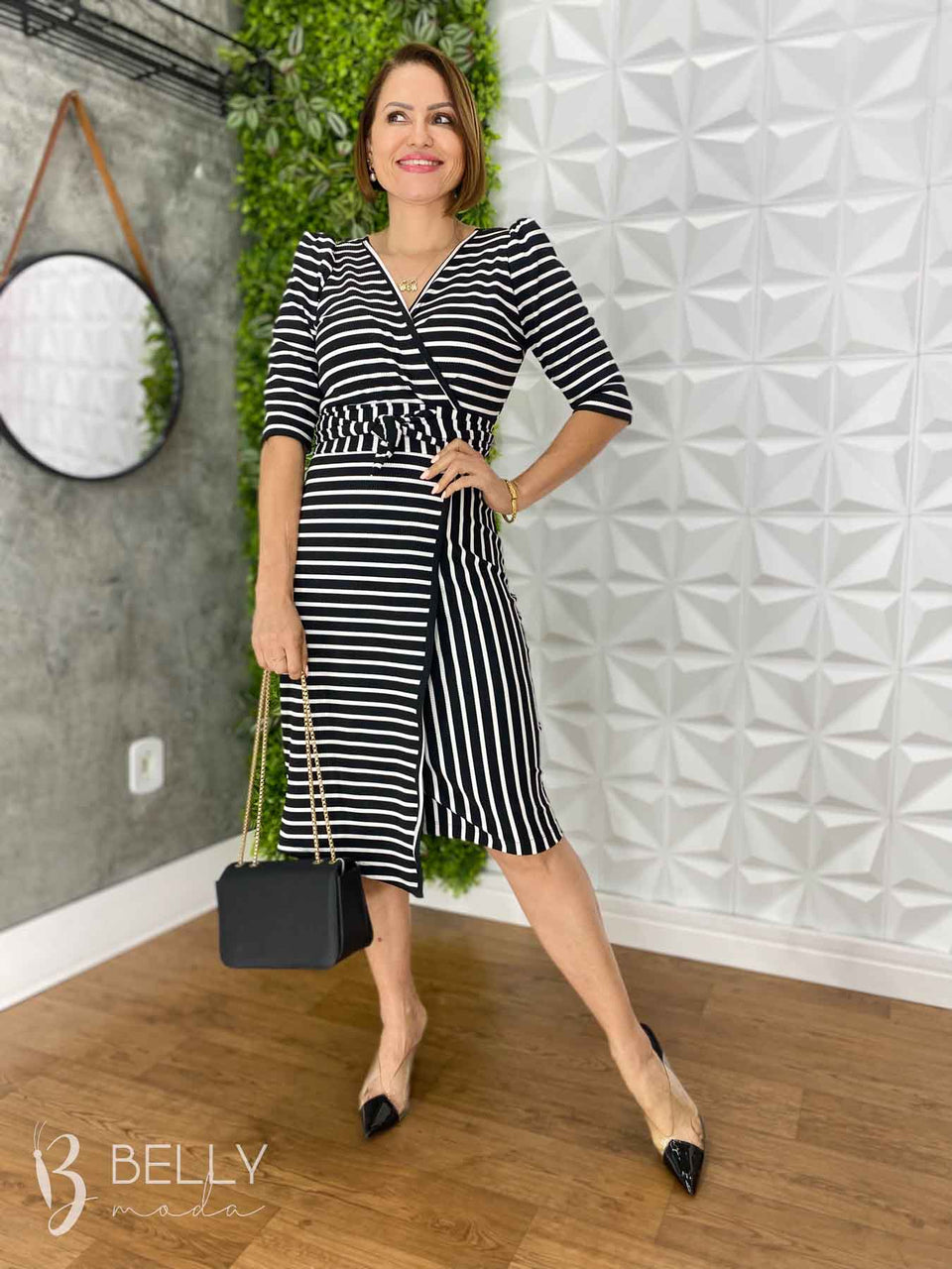 Vestido Suellen Midi Assimétrico Manga 3/4 da Belly Moda é confeccionado em malha canelada, com modelagem ajustada e recortes assimétricos na saia. Possui transpasse fechado na saia, assimetria nas listras e manga 3/4. Seu diferencial é o transpasse frontal que valoriza o colo com um decote em "V". O comprimento é abaixo da altura do joelho, proporcionando um visual elegante e moderno.