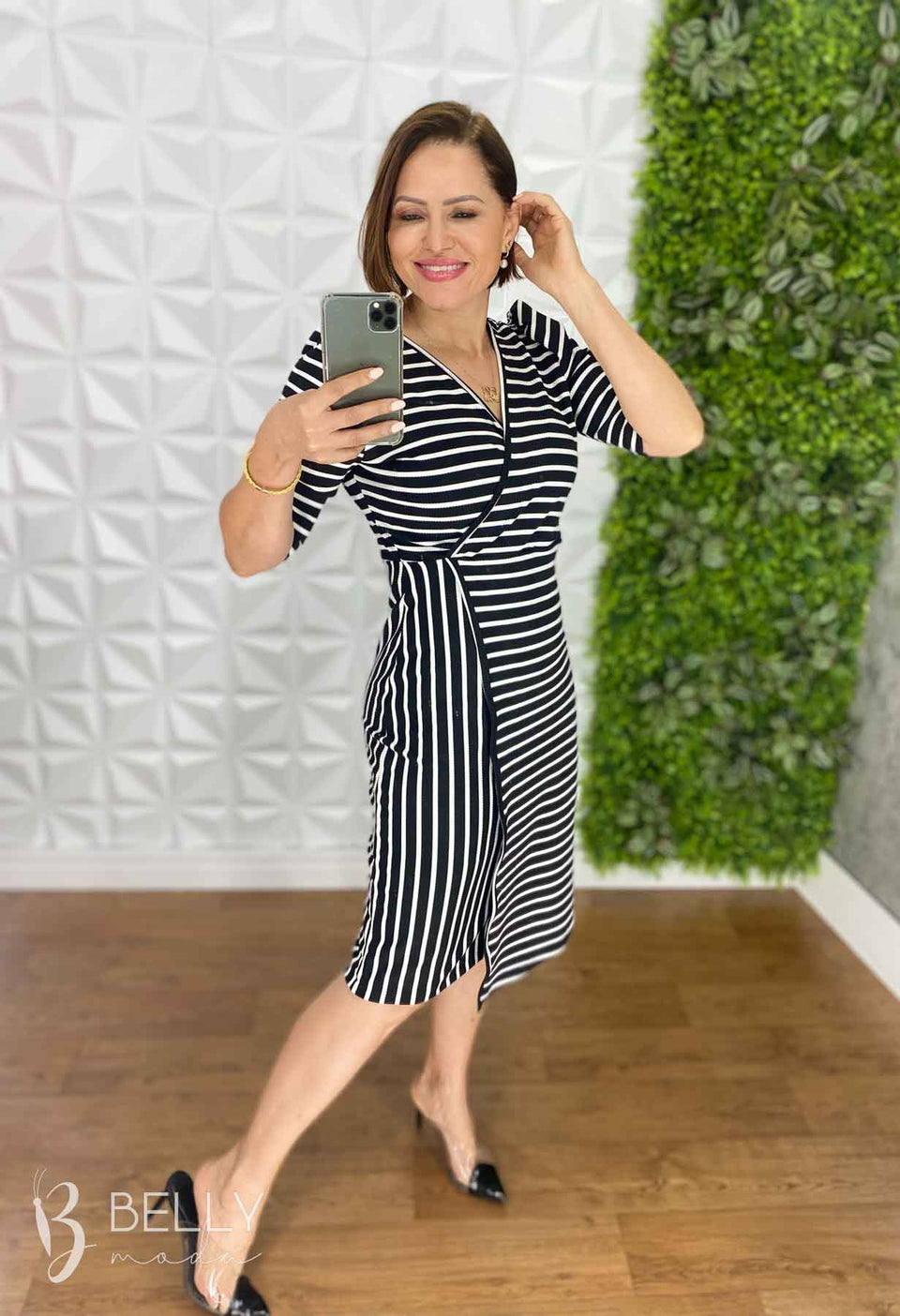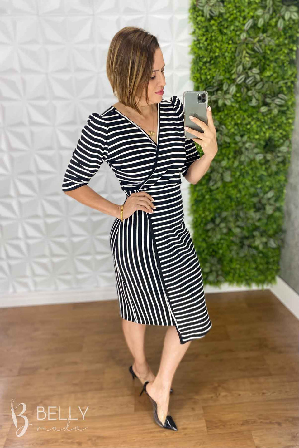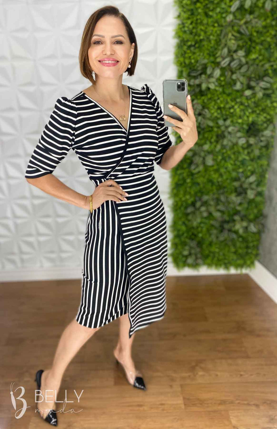 Vestido Suellen Midi Assimétrico Manga 3/4 da Belly Moda é confeccionado em malha canelada, com modelagem ajustada e recortes assimétricos na saia. Possui transpasse fechado na saia, assimetria nas listras e manga 3/4. Seu diferencial é o transpasse frontal que valoriza o colo com um decote em "V". O comprimento é abaixo da altura do joelho, proporcionando um visual elegante e moderno.
