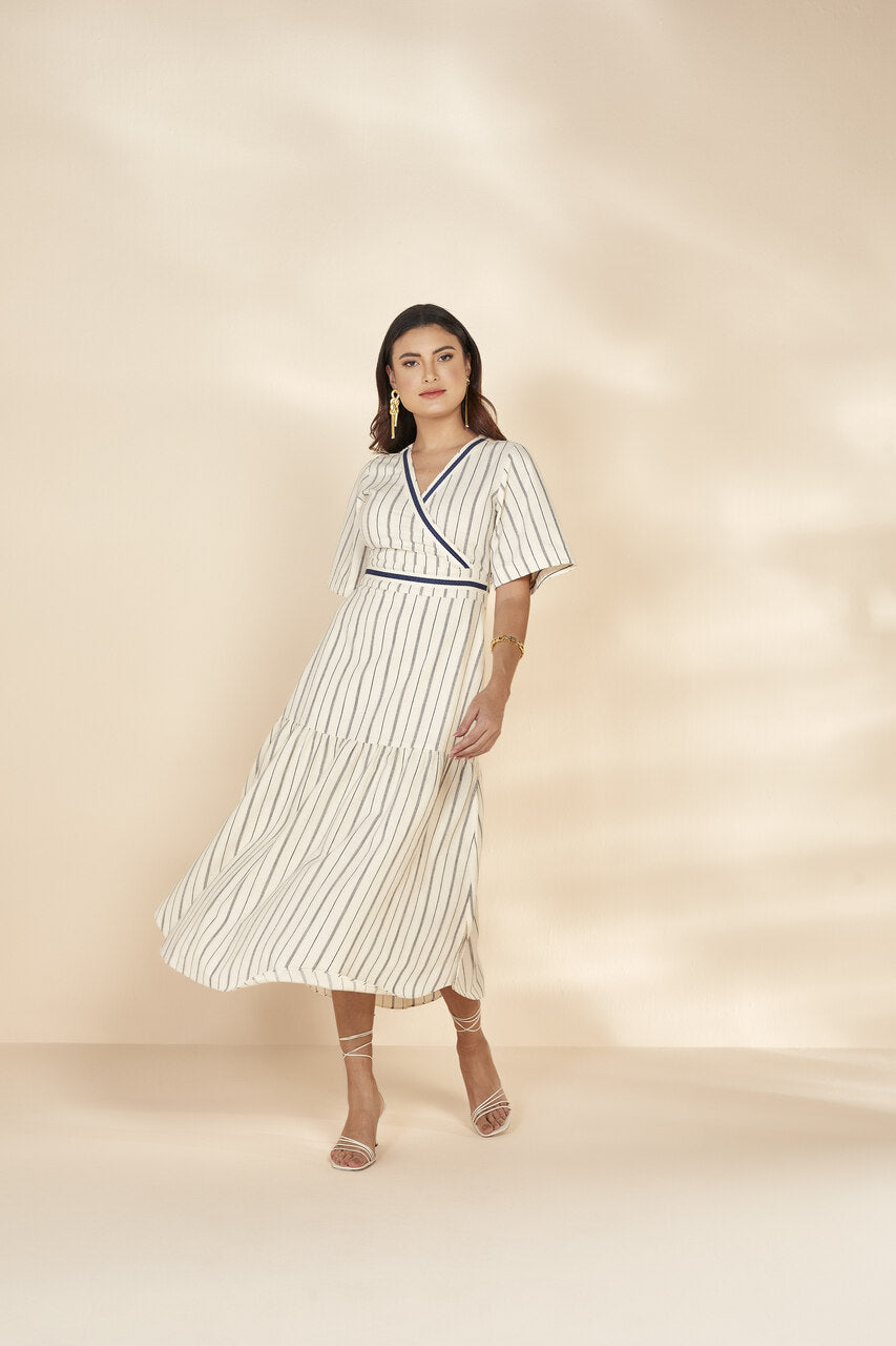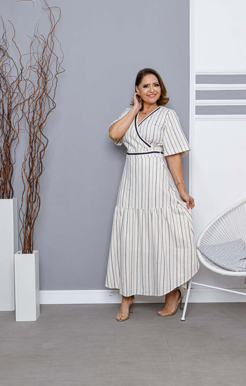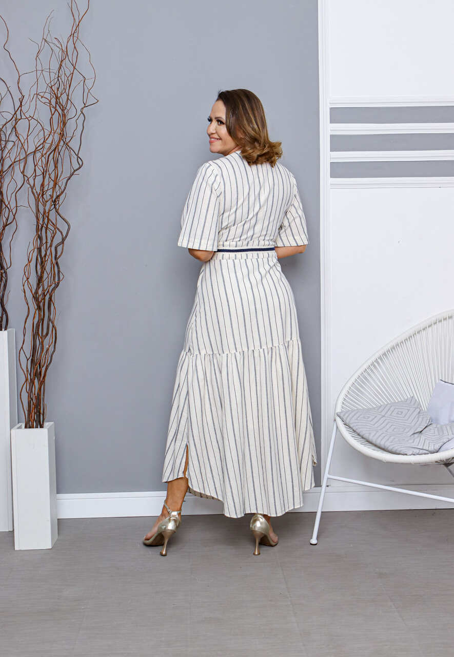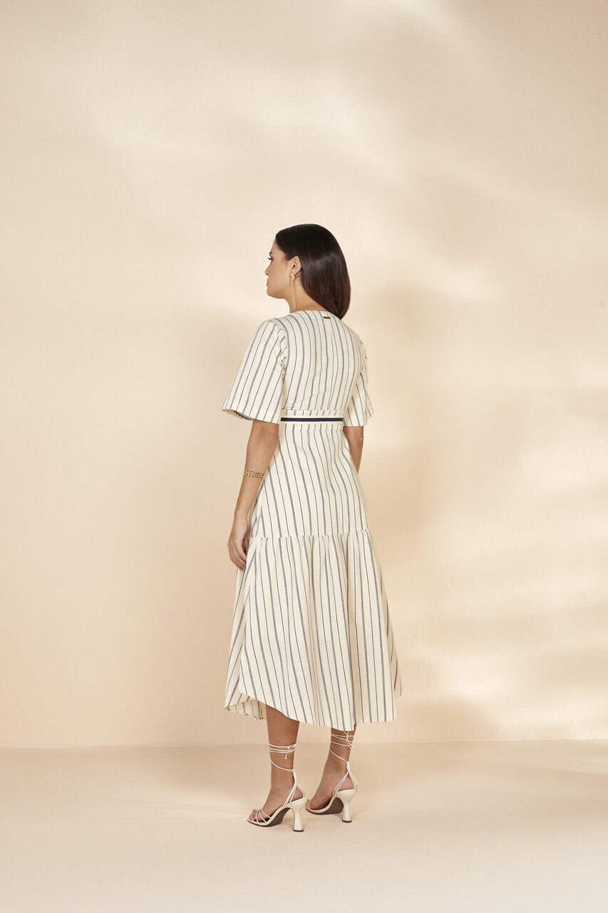 Vestido listrado confeccionado em tecido plano de alta qualidade, com pespontos na cor off-white e aviamentos em banho metalizado dourado. Possui detalhe em transpasse, proporcionando um visual moderno e elegante.